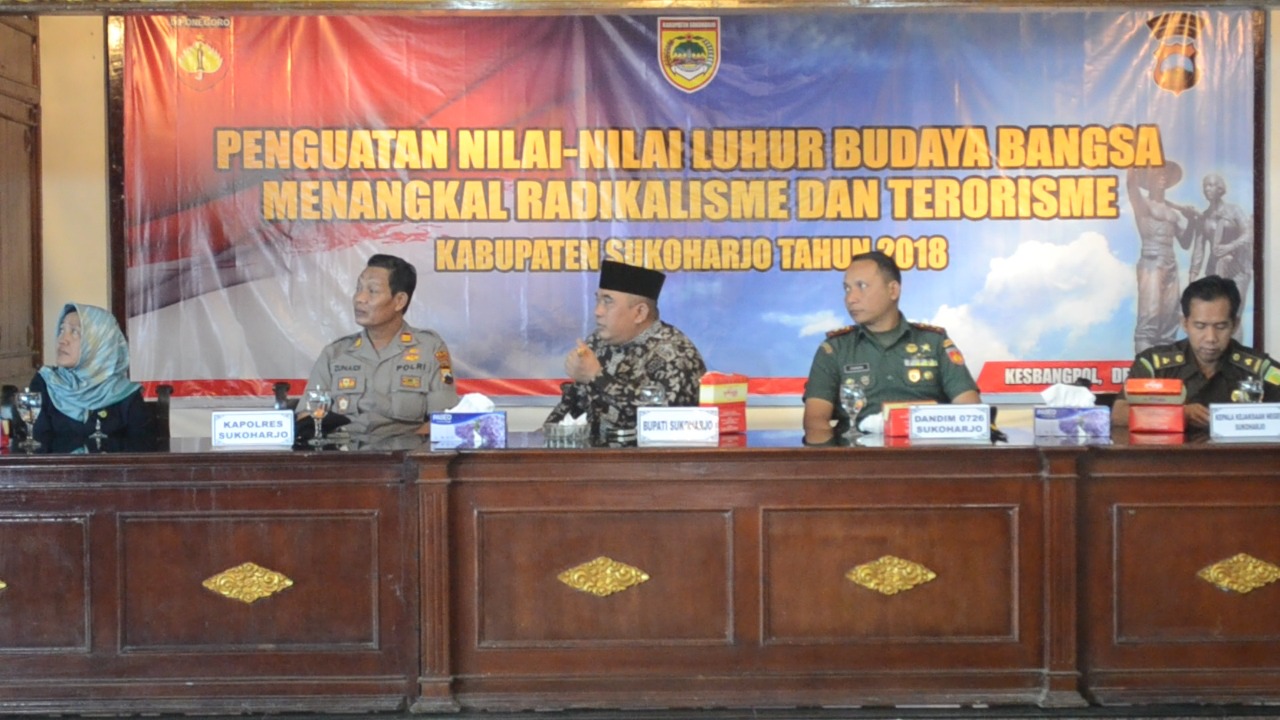 Kepala Kantor Kesbangpol Kabupaten Sukoharjo Gunawan Wibisono, S.Sos melaporkan bahwa maksud dan tujuan diselenggarakan kegiatan ini adalah untuk meningkatkan nilai-nilai luhur budaya bangsa dalam menangkal radikalisme dan terorisme bersama elemen anak bangsa khususnya esensisnya di Kabupaten Sukoharjo, tujuan memberikan pembekalan dan pemahaman kepada elemen masyarakat dalam memahami pentingnya karakter bangsa sebagai upaya menjaga eksistensi nilai-nilai luhur budaya dalam menangkal radikalisme dan terorisme, “jelas Kepala Kesbangpol Gunawan Wibisono dalam laporannya.