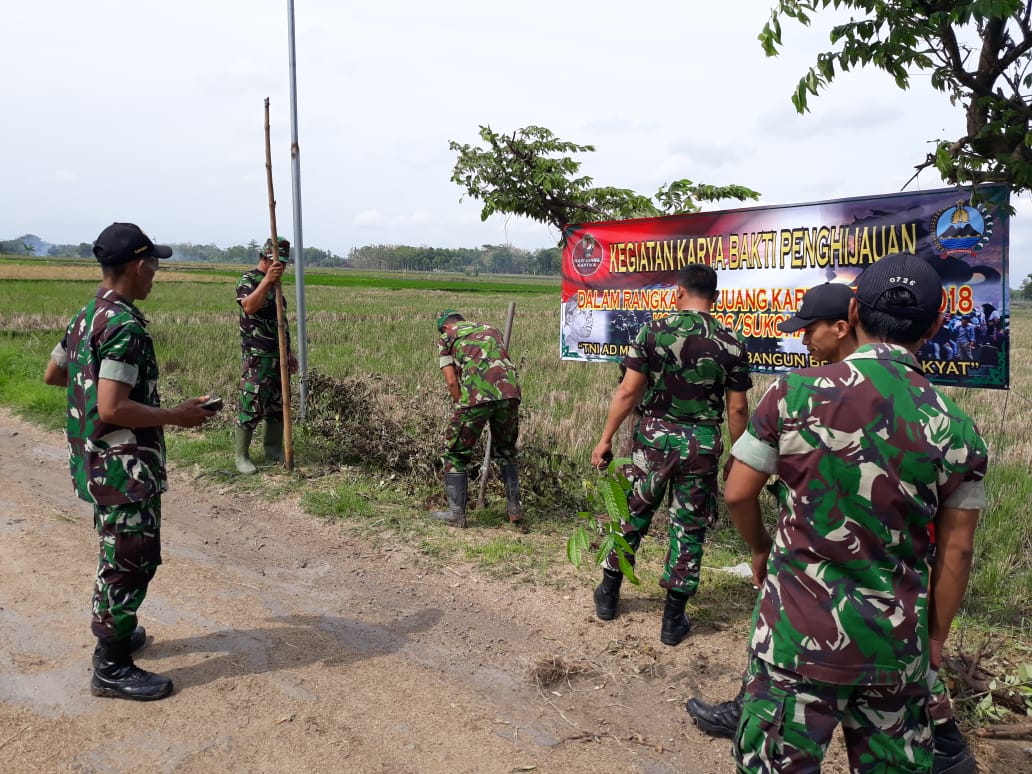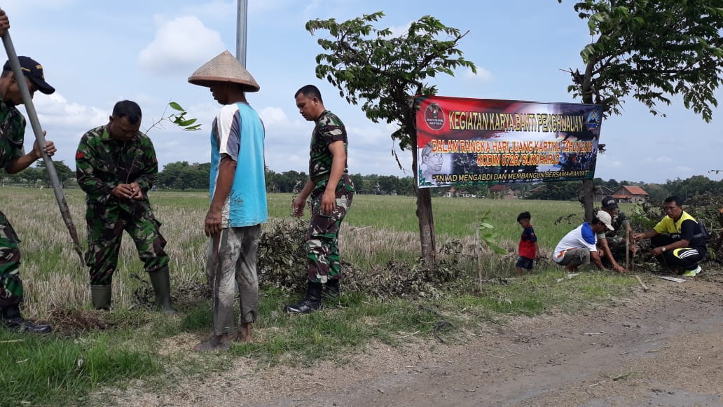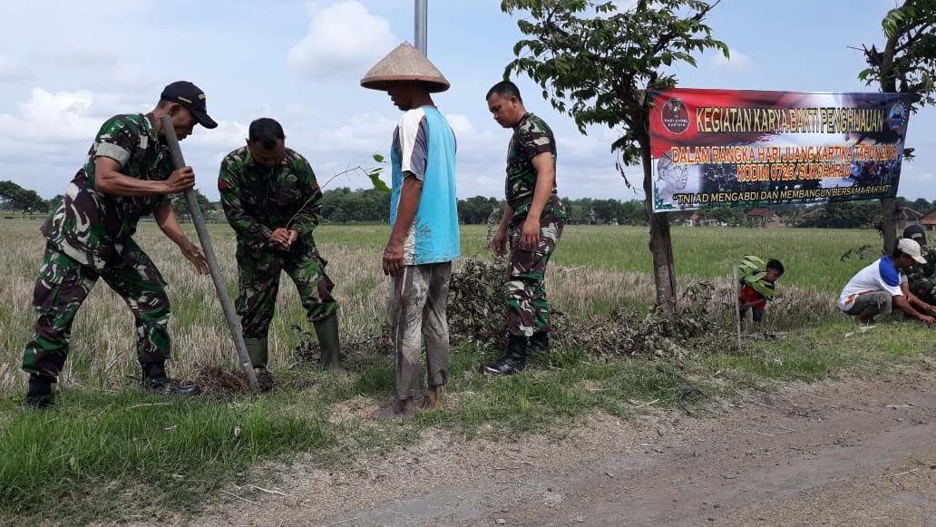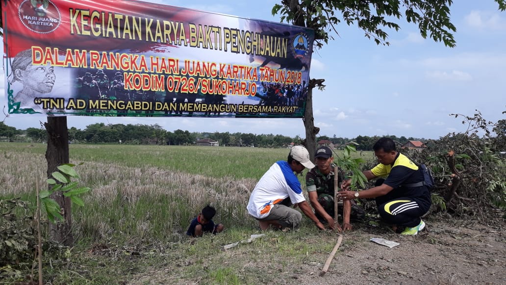 Sukoharjo (10/12/18) Dengan sasaram di Turus jalan Dagen – Kabangan Desa Mranggen Kecamatan Polokarto Kabupate Sukoharjo, Danramil 11 Polokarto Kapten Arh Tavip Joko Sukoco beserta para anggota dan masyarakat melaksanakan penanaman pohon dalam rangka hari juang kartika ke 73 tahun 2018.Tampak sekitar 15 orang masyarakat beserta 13 orang anggota Koramil dipimpin Danramil melaksanakan kerja bakti bersama melaksanakan penghijauan di sepanjang jalan tersebut, pada hari Minggu (09/12) dimulai pukul 07.30 wib.