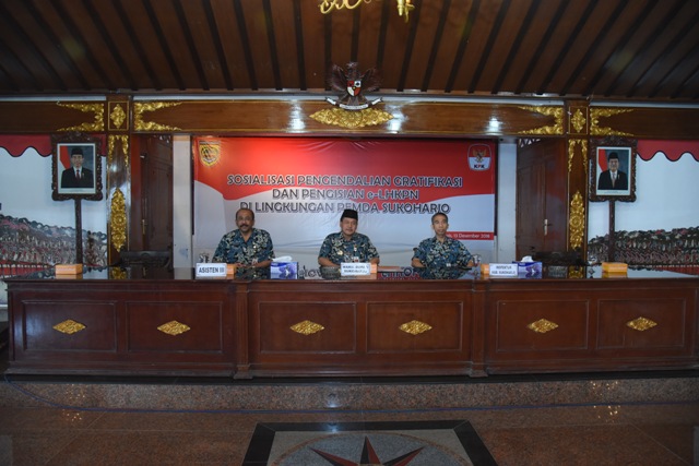 SUKOHARJO– Pemerintah Kabupaten Sukoharjo melalui Inspektorat Kabupaten Sukoharjo menggelar Sosialisasi Pengendalian Gratifikasi dan pengisian e- LHKPN atau laporan harta kekayaan penyelenggara negara secara elektronik bagi pejabat Eselon III baru dan eselon IV di Lingkungan Pemerintah Kabupaten Sukoharjo di Pendopo Graha Satya Praja (GSP), Kamis (13/12). Kegiatan dibuka secara langsung oleh Wakil Bupati H. Purwadi SE, MM.