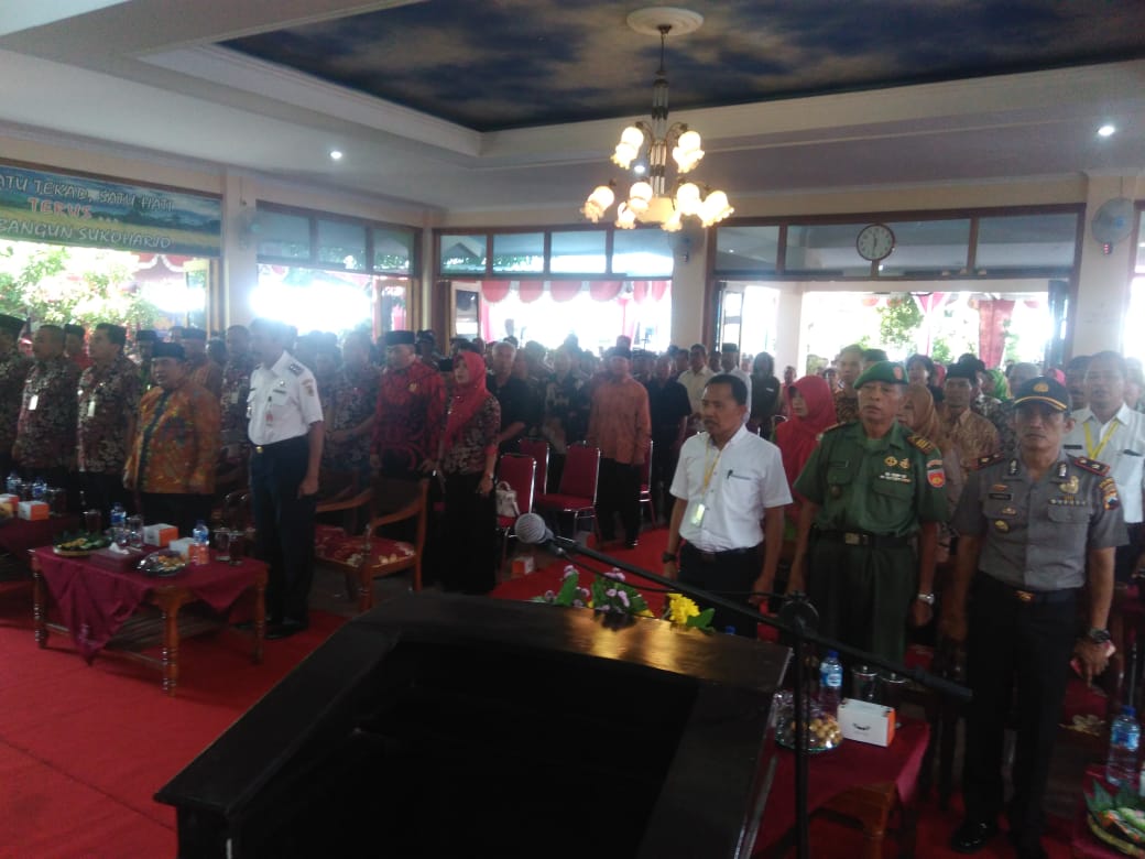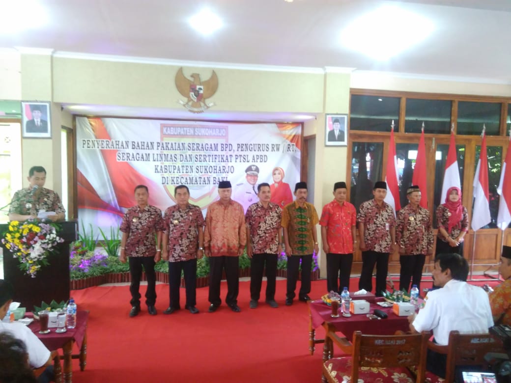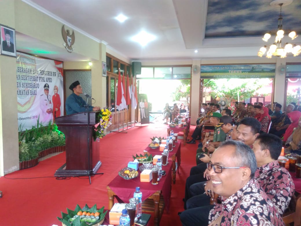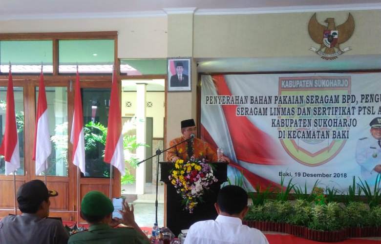 Sukoharjo (20/12/18) Bertempat di di Pendopo Graha Wijaya Jl.Wr.Supratman no.15 Ds. Kadilangu Kec. Baki, Sukoharjo Bupati Sukoharjo H.Wardoyo Wijaya SH MH pada hari Senin (19/12) pukul 11.00 sd 12.20 wib beserta Rombongan melaksanakan Penyerahan bantuan Seragam kepada Anggota BPD,serta Pengurus RT/RW, Linmas dan penyerahan Sertifikat PTSL APBD Kab Sukoharjo.Bupati beserta rombongan hadir disambut para pejabat Forkopimcam Baki Roni Wicaksono S.Stp M HUM ( Camat Baki ), Kapten inf Langgeng ( Danramil 8 Baki ) dan Kompol Sunarto,SH.MH.(kapolsek Baki). Acara berlangsung meriah dihadiri sekitar 3000 orang, bapak Gunawan Wibisono S. Stp, S.Sos ( Kepala Kesbangpol Kab.Sukoharjo), Dwi Purnama SH M.Kn (Kepala ATR BPN Kab Sukoharjo), Ari Haryanto (Kabag Pemerintahan Kab Sukoharjo ), Ir Suraji ( Kepala DPU PR Kab Sukoharjo), Heru Indarjo SH, MH ( Kasatpol PP Kab.Sukoharjo), Joko Indriyanto S.Sos (Kepala Dishub Kab.Sukoharjo)
