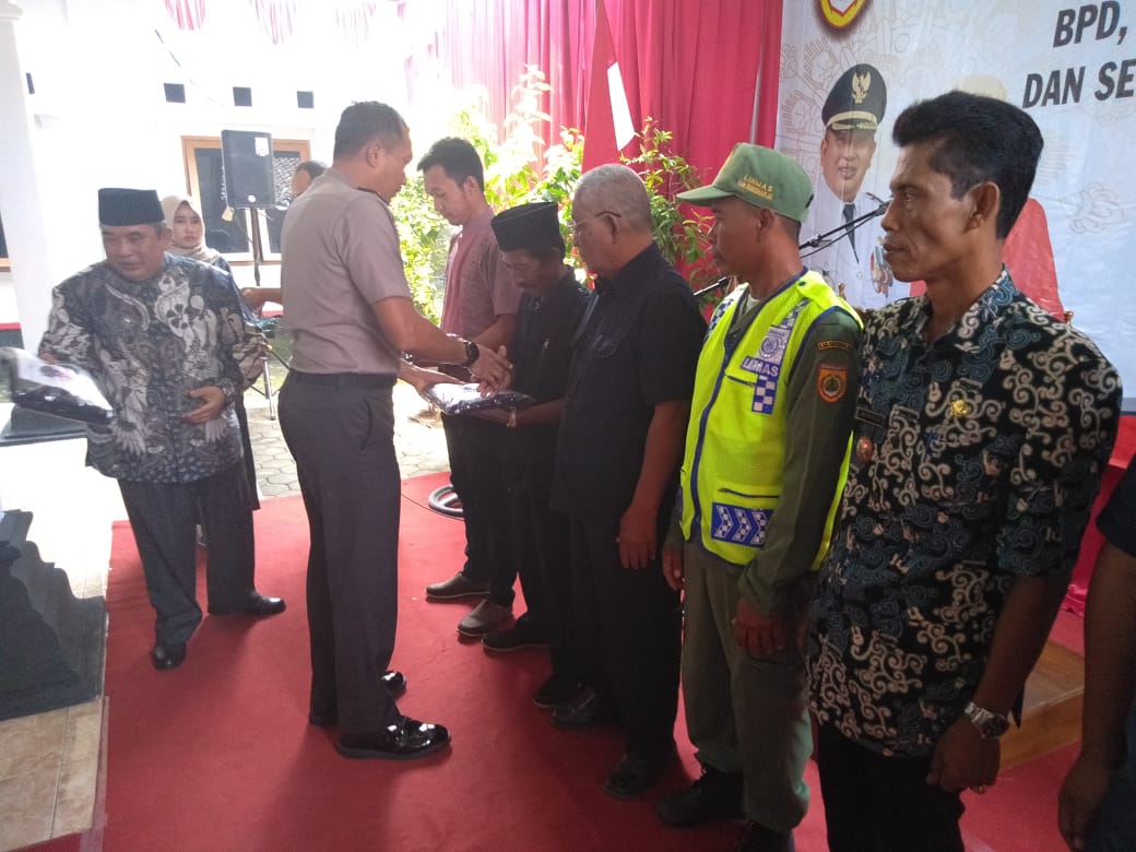 Dalam sambutannya Bupati Sukoharjo menyampaikan ucapan selamat kepada para Kepala Desa terpilih, dikatakan bahwa pengurus BPD, Rt/Rw merupakan mitra kerja dari Pemdes maka sudah selayaknya kalau hari ini semuanya mendapatkan seragam. Khusus kepada Linmas diberikan pakaian jadi untuk melaksanakan tugas pada tanggal 17 April 2019 pengamanan Pileg dan Pilpres.