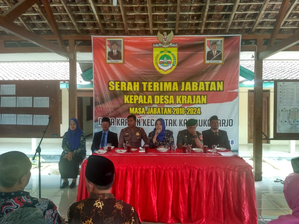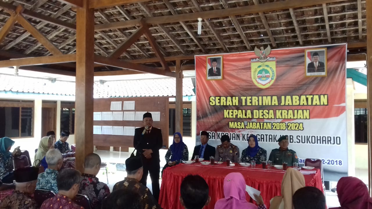Acara dibuka dengan menyanyikan lagu Indonesia Raya, pembacaan SK Bupati Sukoharjo tentang Pemberhentian Kepala Desa Krajan masa jabatan periode tahun 2012-2018, Pengangkatan Pejabat Kepala Desa Krajan, Pengakatan Kepala Desa Krajan masa jabatan periode Tahun 2018-2024 dilanjutkan dengan penandatanganan Berita Acara Serah terima jabatan kepala Desa Krajan dari Bpk H.Abu Sungeb kepada Penjabat Kepala Desa Krajan Ibu Sri Ningsih.