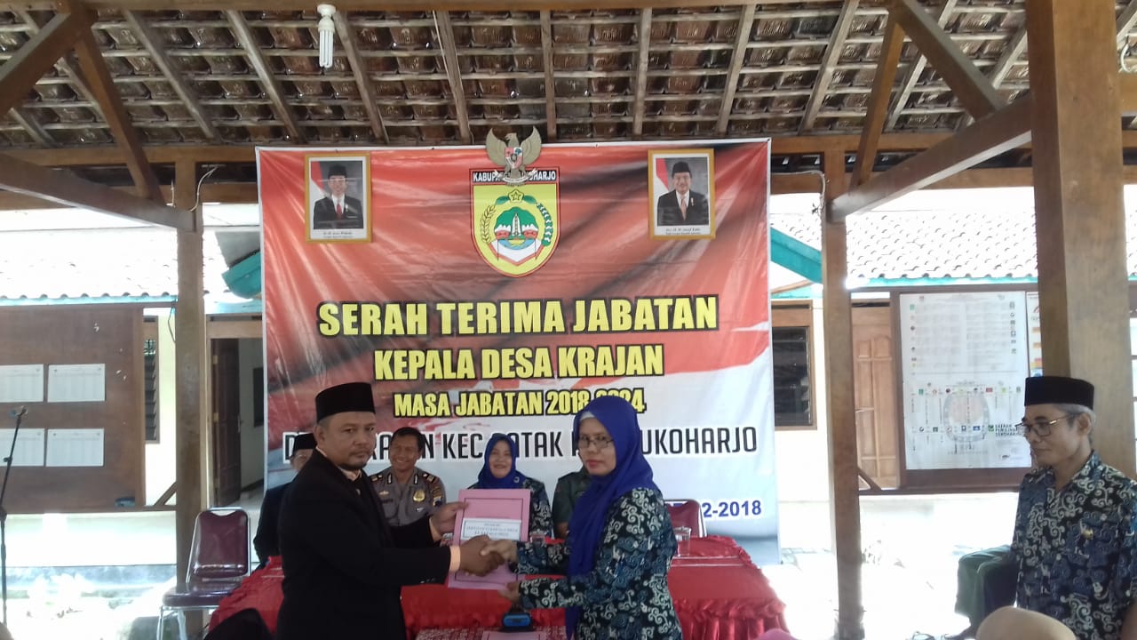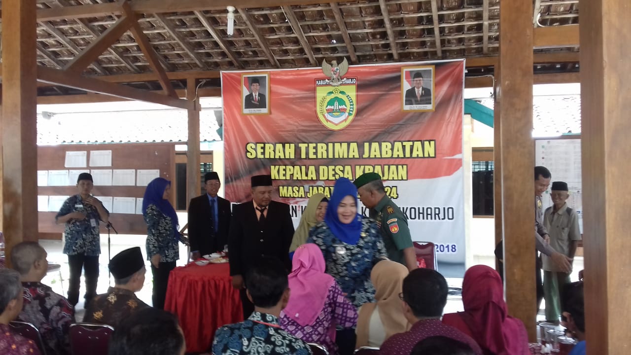 Sukoharjo (11/01/19) Serah terima jabatan Kepala Desa Krajan untuk Periode tahun 2018 s.d 2024 dilaksanakan pada hari Kamis (10/01) pukul 10.00 wib bertempat di Pendopo Balai Desa Krajan Kec.Gatak Kabupaten Sukoharjo.