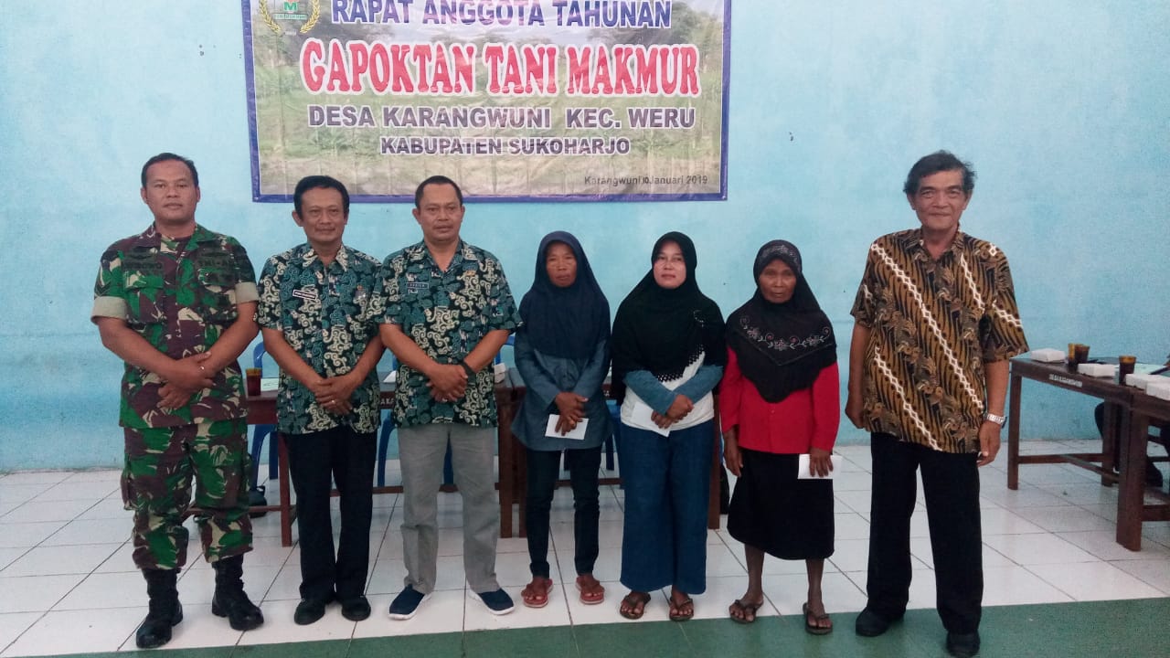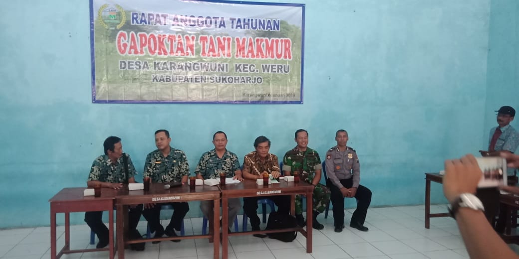 Sukoharjo (11/01/19) Babinsa Koramil 05 Weru wilayah desa Karangwuni Sertu Prapto Wibowo, pada hari Kamis tanggal (10/01) Pukul 09.00 s.d 11.00 wib menghadiri Rapat Anggota Tahunan (RAT) Gapoktan Tani Makmur tahun 2018 yang mengambil tempat di GOR Dk. Ngampas RT 01/RW 05 desa Karangwuni, Weru Kabupaten Sukoharjo.Kegiatan RAT tersebut dibuka oleh ketua Gapoktan Bpk Suranto Andy Nugroho kemudian dilanjutkan dengan sambutan Kepala desa Karangwuni, sambutan dari Dinas Pertanian, sambutan Pengawas Gapoktan kab. Sukoharjo dan sambutan dari fihak Kecamatan Weru.