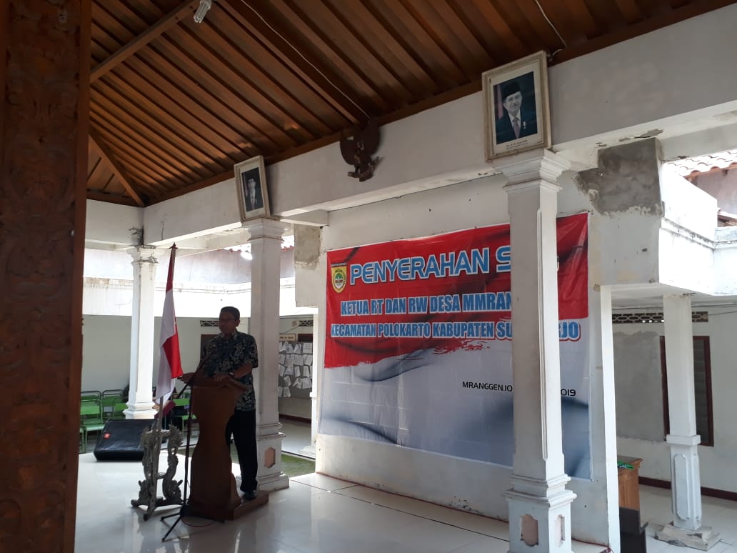Sukoharjo (11/01/19) Babinsa Koramil 11 polokarto wilayah desa Mranggen, Pelda Agus Supriyanto, Senin (10/01) pukul 10.45 wib menghadiri kegiatan Penyerahan SK Ketua RT dan RW desa Mranggen Kecamatan Polokarto, Sukoharjo yang dilaksanakan di di balai desa Mranggen Kecamatan Polokarto Kab. Sukoharjo.