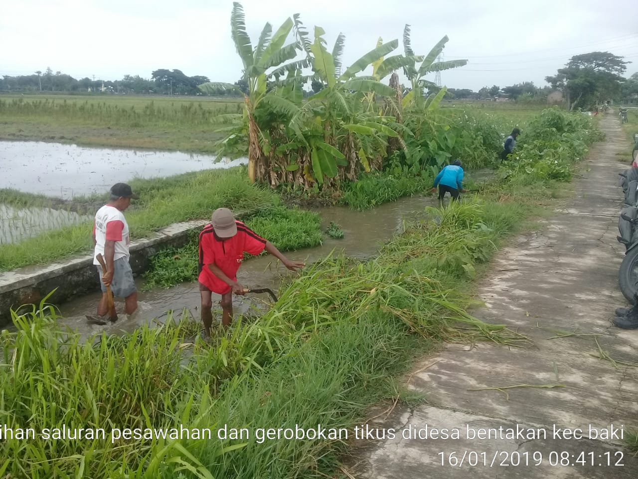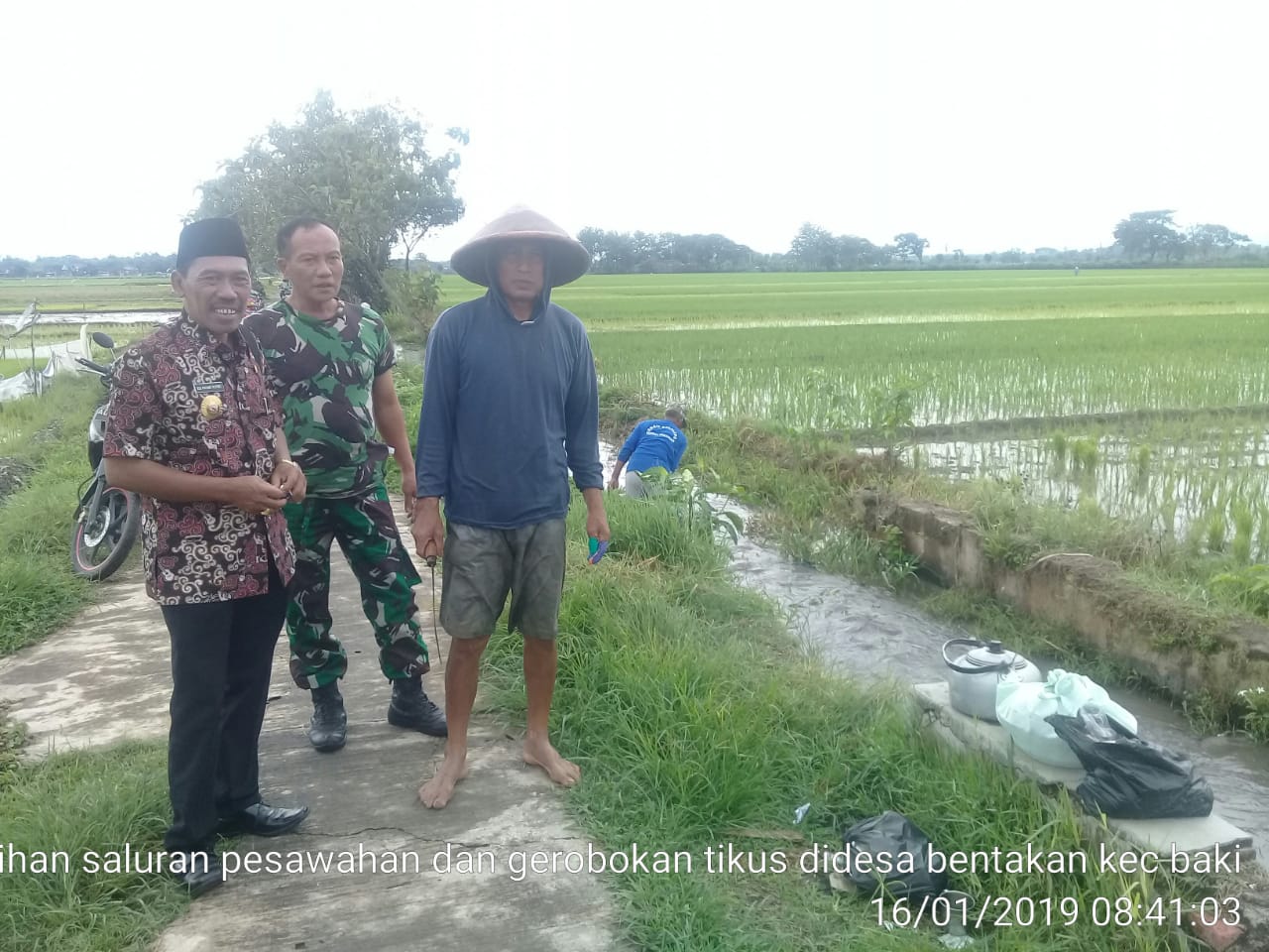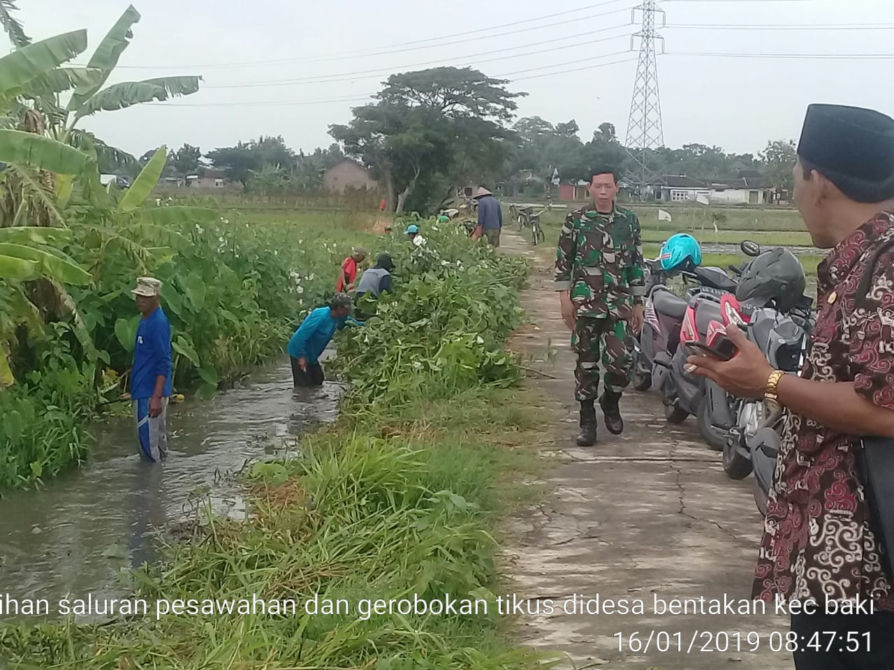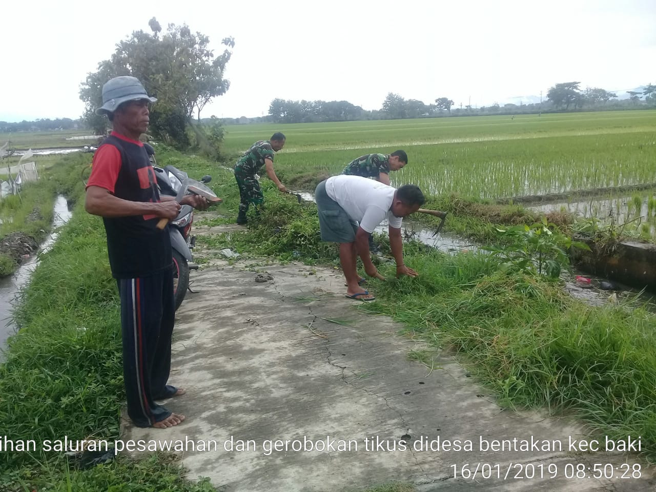 Sukoharjo (17/01/19) Para anggota Koramil 08 Baki dipimpin Danramil Kapten Inf Suroto, pada hari Rabu (17/01) pukul 08.45 tampak membantu para petani di desa Bentakan, Baki membersihkan saluran irigasi di area perswahan tersebut.Kegiatan bersih irigasi desa Bentakan ini dihadiri para anggota kelompok tani dan anggota koramil 08 Baki dan dilanjutkan dengan gropyokan tikus. Sekitar 30 orang, ramai-ramai membabat rumput-rumput liar dan mengangkat sampah di aliran saluran irigasi tersebut agar arus air irigasi berjalan dengan lancar, untuk mengairi areal persawahan. Gropyokan tikus juga dilaksanakan saat itu untuk mengantisipasi padi gagal tumbuh, karena untuk diketahui bahwa tikus tidak hanya mengganggu/mencuri bulir padai saja, namun juga sering merusak tanaman padi yang baru tumbuh.