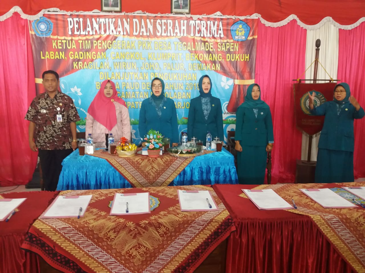 Dihadiri sekitar 250 orang, serah terima Ketua Tim Penggerak PKK ini berkaitan dengan pergantian Kepala desa di wilayah tersebut, kecuali desa Plumbon dan desa Triyagan. Setelah acara serah terima ketua Tim penggerak PKK dilanjutkan dengan pengukuhan Bunda Paud Desa Sapen,Laban, Gadingan, Dukuh, Demakan.