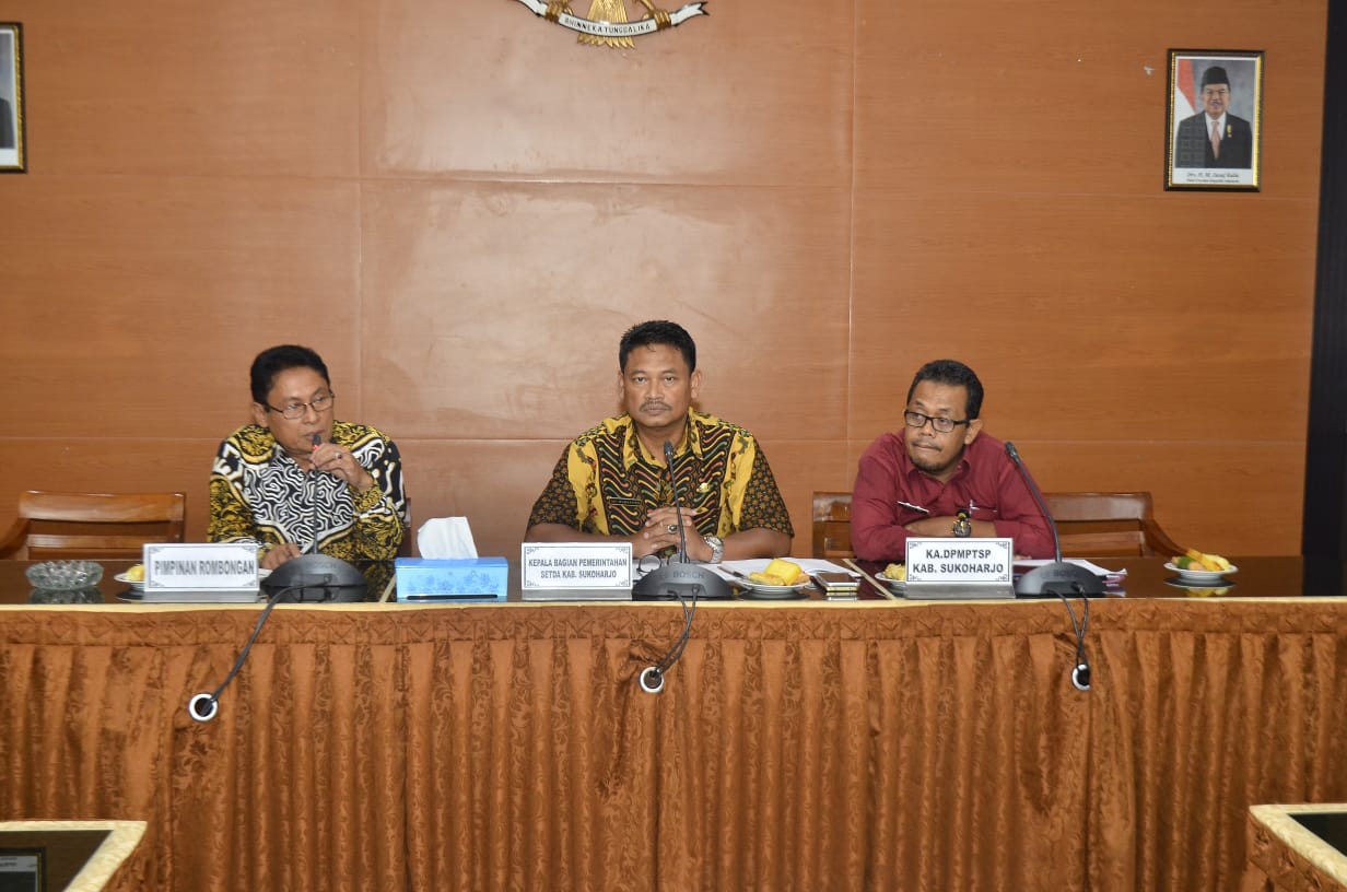 Penerimaan Kunjungan Kerja dari Panitia Khusus II DPRD Kabupaten Sleman Provinsi Daerah Istimewa Yogyakarta di Kabupaten Sukoharjo pada hari Selasa, 29 Januari 2019 dimulai pukul 10.00 WIB bertempat di Graha Satya Karya Sukoharjo. Kunker diterima oleh Kepala Bagian Pemerintahan Sekda, Bp. Ari Haryanto, S.Pd, M.Si beserta Bp. Agustinus Haryanto, S.Sos, M.Hum. Turut hadir dalam penerimaan kunker ini dari Inspektorat, Bappelbangda, BKD, Satpol PP, DPMPTSP, Bagian Hukum dan Bagian Humas Protokol. Rombongan dari Pansus II DPRD Kabupaten Sleman berjumlah 15 orang dipimpin oleh Ketua Rombongan Bp. Robertus Ramelan, SE. Materi yang dipilih dalam kunker kali ini adalah pengembangan wawasan dan penambahan referensi terkait Raperda tentang Penyelenggaraan Perizinan Reklame.