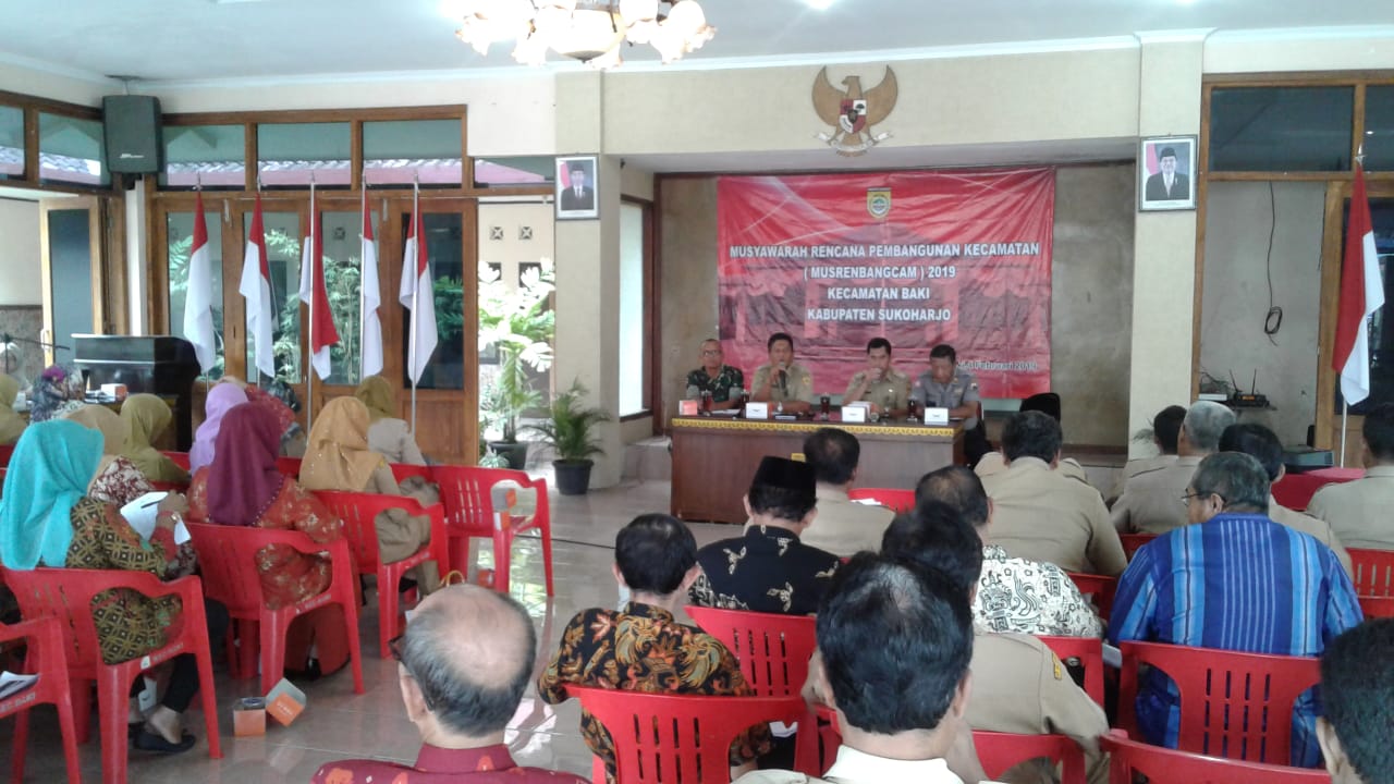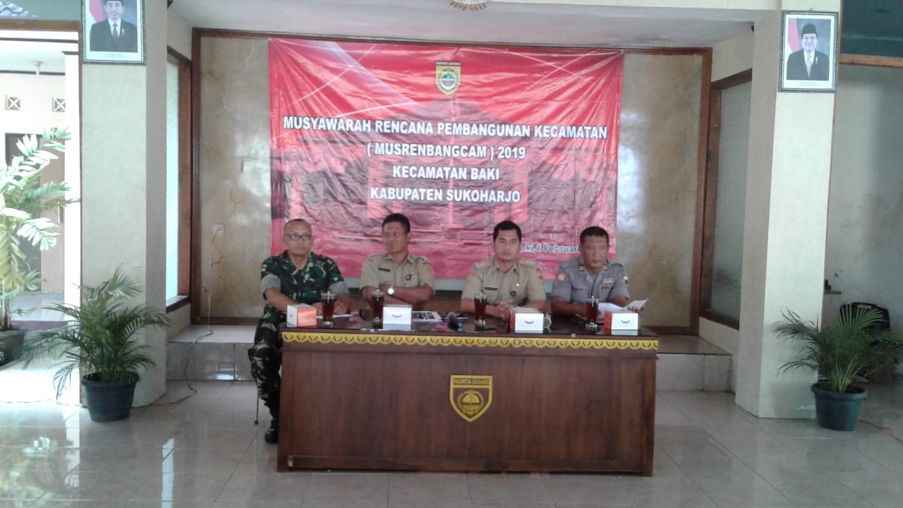 Sukoharjo (06/02/19) Musyawarah Rencana Pembangunan Kecamatan (Musrenbangcam) Tahun 2019 wilayah kecamatan Baki, Kabupaten Sukoharjo dilaksnakan pada hari Senin (04/02) pukul 08.00 wib bertempat di Pendopo Graha wijaya Kantor Kecamatan Baki, Sukoharjo.Musrenbangcam ini merupakan forum musyawarah tahunan para pemangku kepentingan/stakeholders di tingkat kecamatan Baki dalam rangka untuk mendapatkan masukan mengenai kegiatan prioritas pembangunan di wilayah kecamatan berdasarkan pada masukan dari hasil Musrenbang desa/keluraha, serta menyepakati rencana kegiatan lintas kelurahan di wilayah kecamatan Baki.