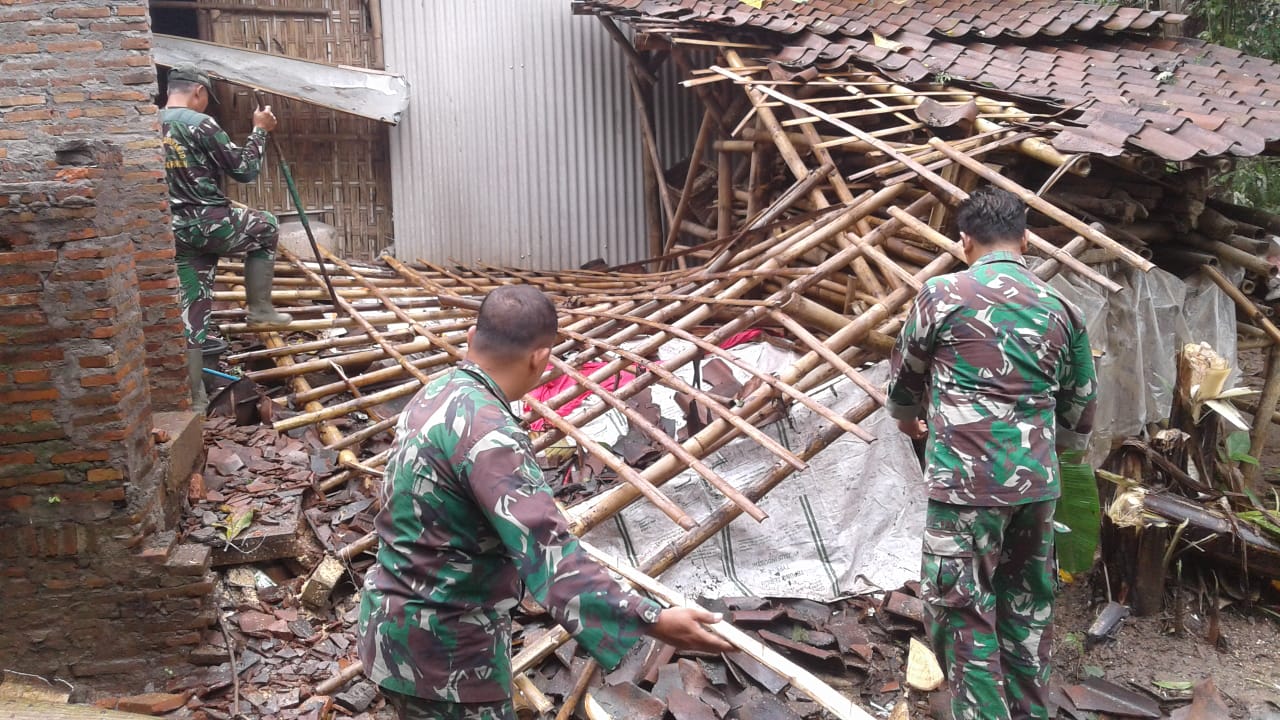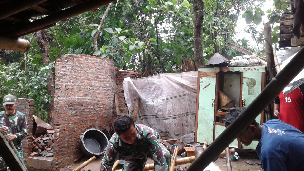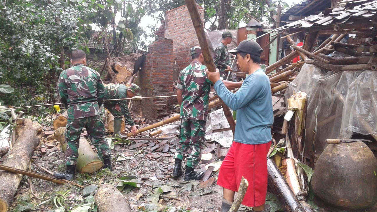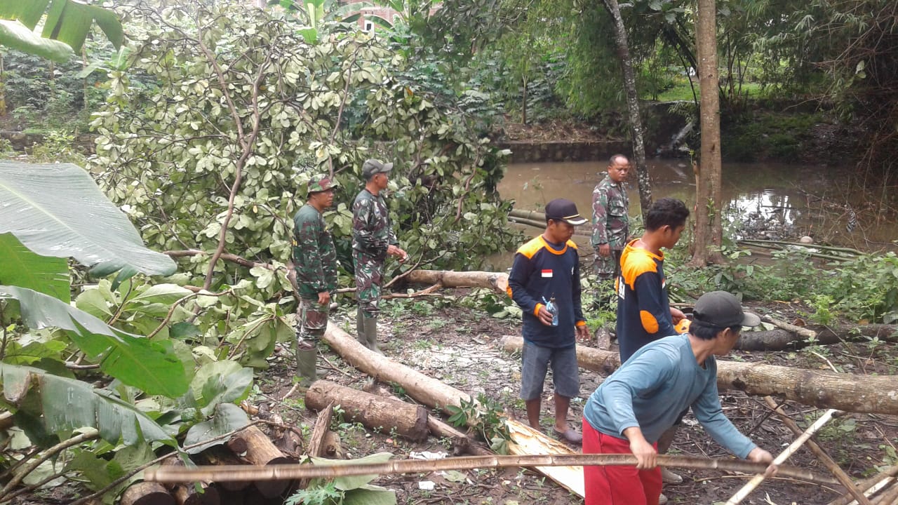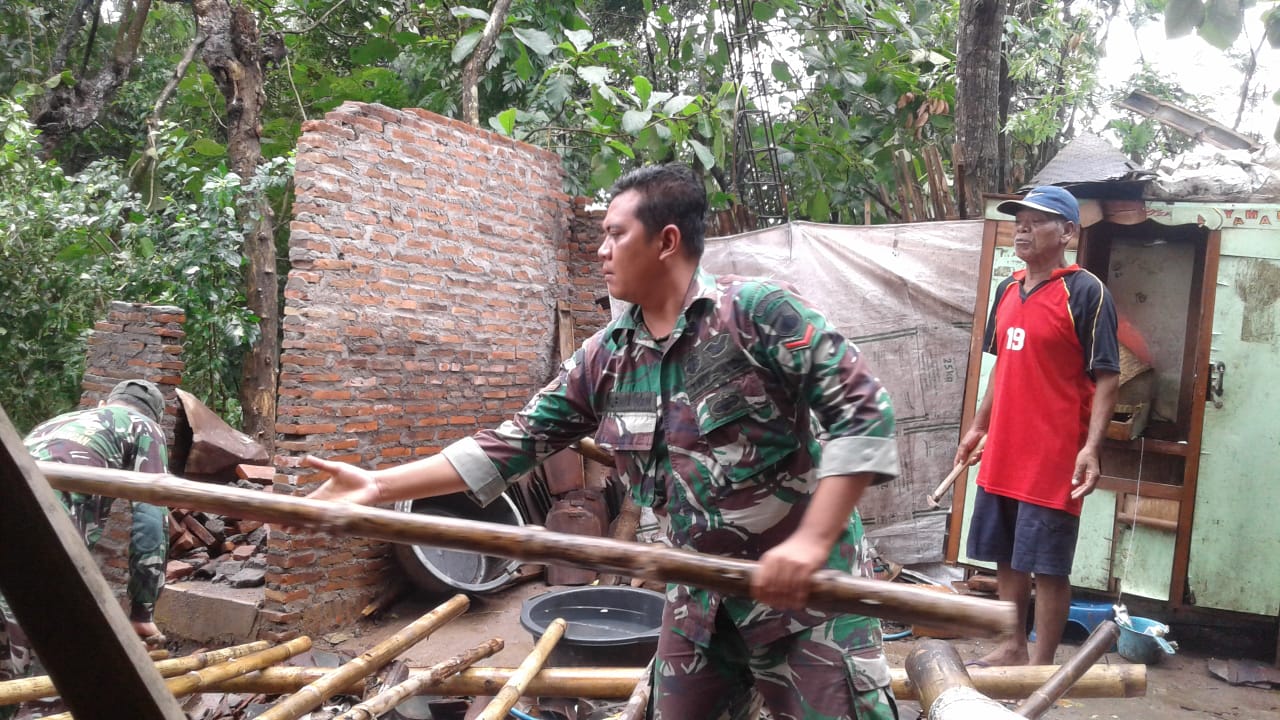 ANGGOTA KORAMIL GROGOL BANTU PAK SUWARDI BERSIHKAN PUING RUMAH TERTIMPA POHON AKIBAT ANGIN RIBUT