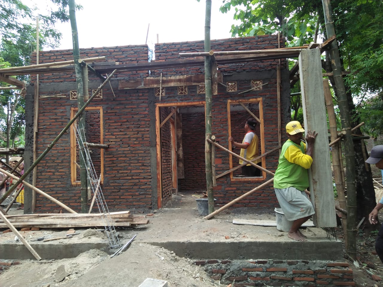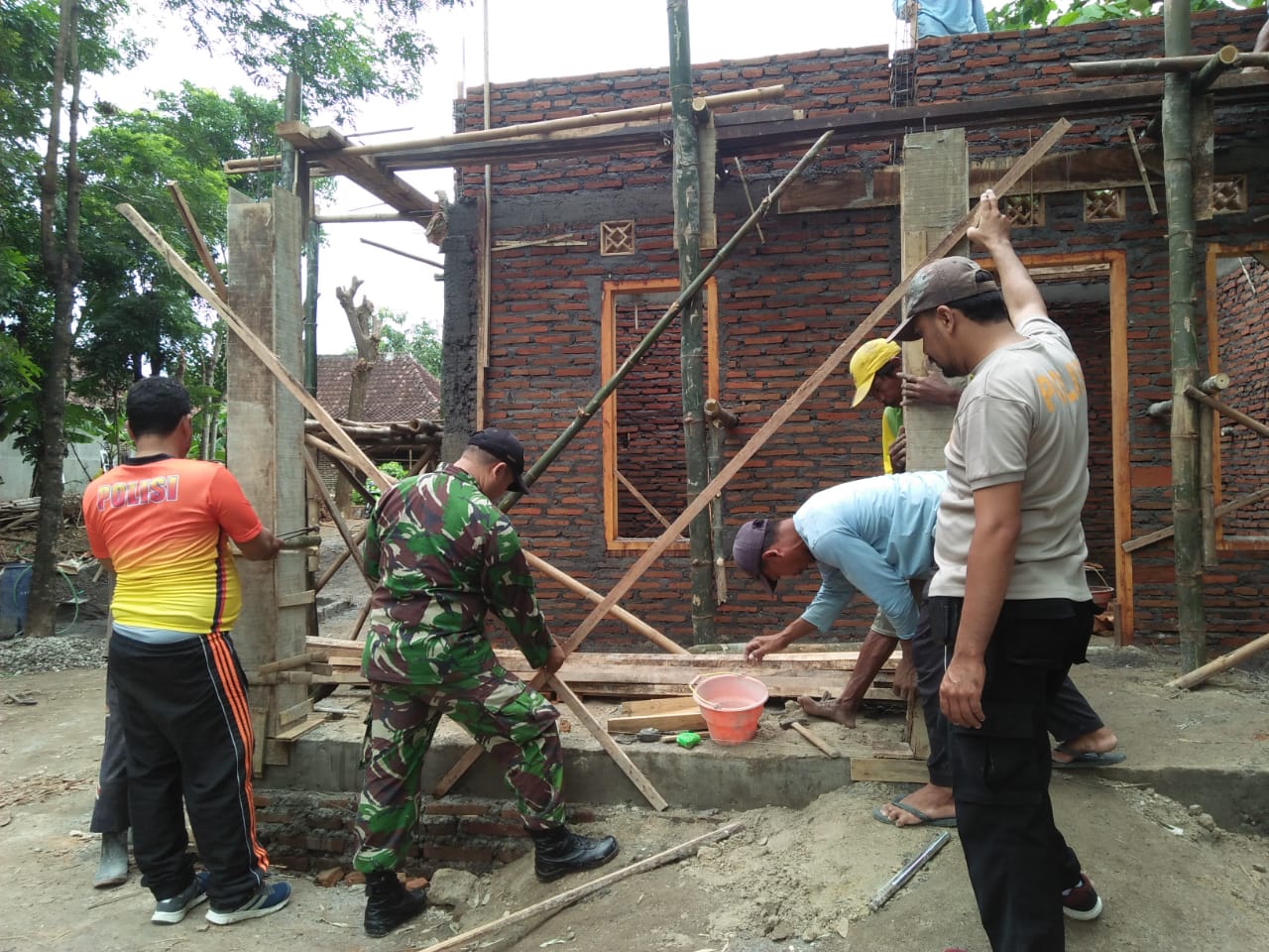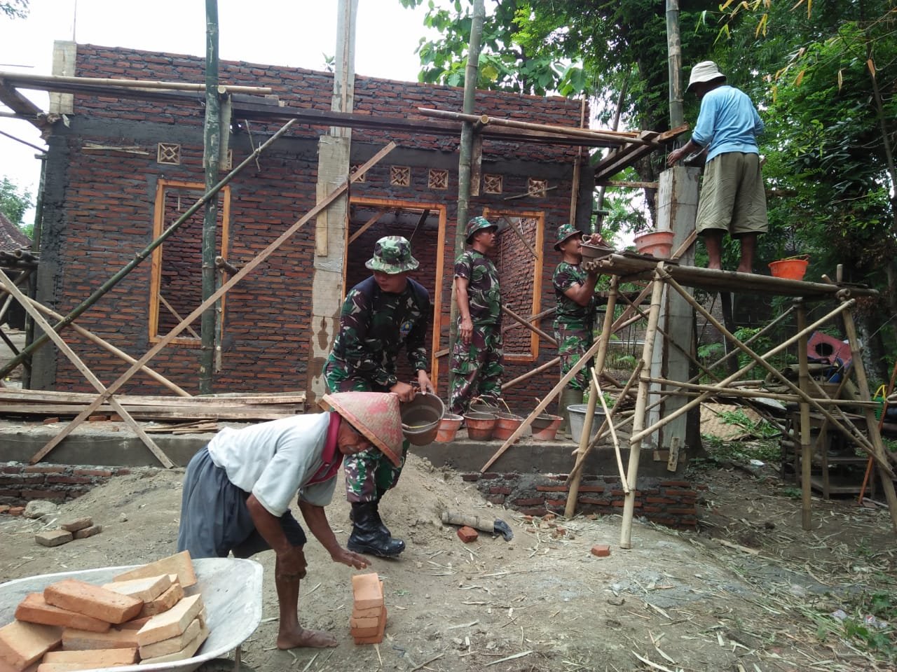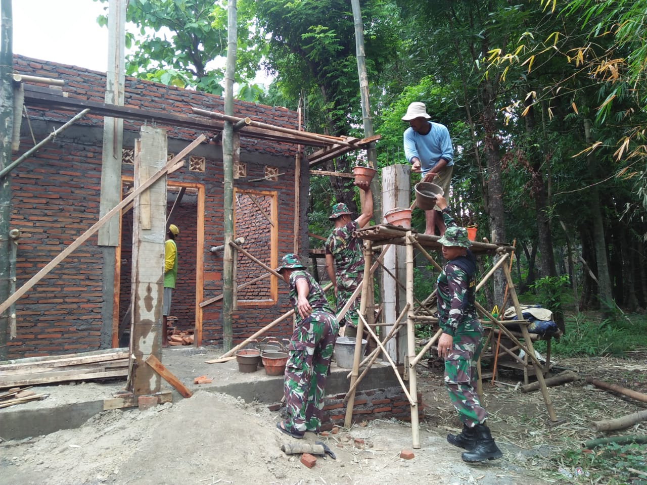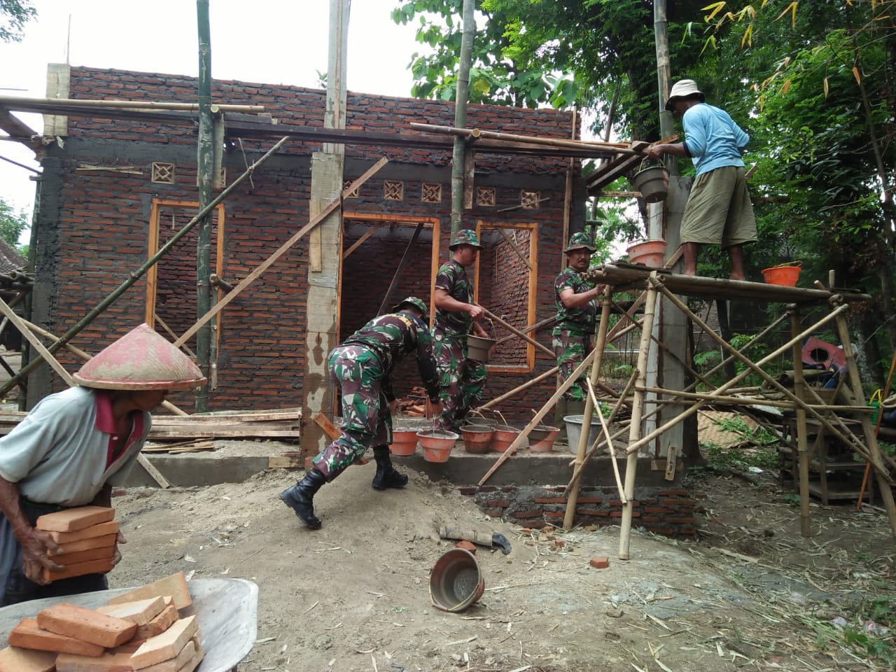 Sukoharjo (13/02/19) Karya Bakti bedah Rumah Tidak Layak Huni (RTLH) milik Ibu Warti warga dukuh Wonosari RT 02/06 desa Mranggen, Polokarto Kabupaten Sukoharjo pada hari Selasa (13/02) kembali dilanjutkan.Kegiatan dimulai sejak pukul 08.00 wib, para warga berbaur dengan para anggota Koramil 11 Polokarto ramai-ramai menyelesaikan pekerjaan hari itu. Tampak progress pekerjaan sudah mencapai ketinggian maksimal isian bata dinding yang dikerjakan sejak hari Senin kemarin. “Kami sedang menyiapkan pemasangan kuda-kuda, belandar maupun kaso-kaso, semoga pekerjaan nantinya selesai tepat waktu, bahkan lebih cepat”, kata Danramil 11 Polokarto, Kapten Arh Tavip Joko Sukoco disela-sela pekerjaan.
