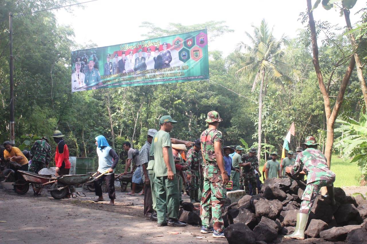 Sukoharjo (01/03/2019) – Ada pemandangan yang menarik saat menyambangi lokasi TMMD Reguler Ke-104 di Desa Celep, Kecamatan Nguter, Kabupaten Sukoharjo, anggota Linmas tampak sibuk memindahkan batu dari pinggir jalan sampai ke lokasi pembuatan talud jalan dengan cara estafet, hal tersebut menggambarkan bertapa semangat kegotong-royongan masih ada serta mendarah daging di kehidupan masyarakat khususnya masyarakat di desa Celep.