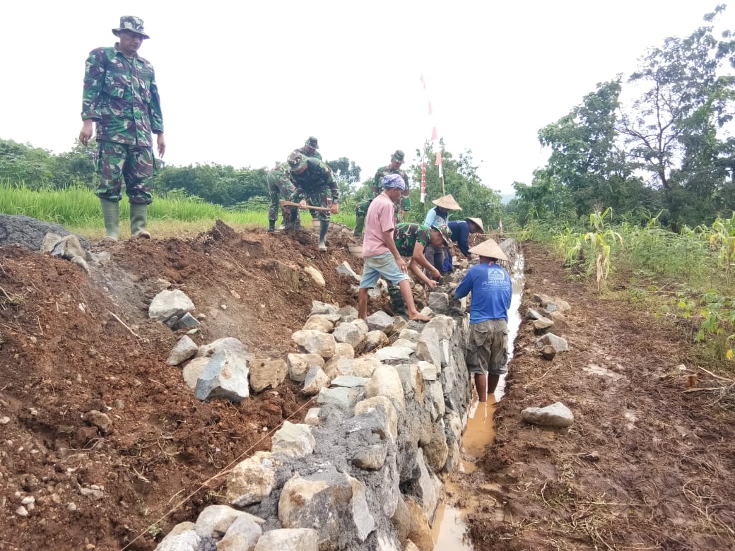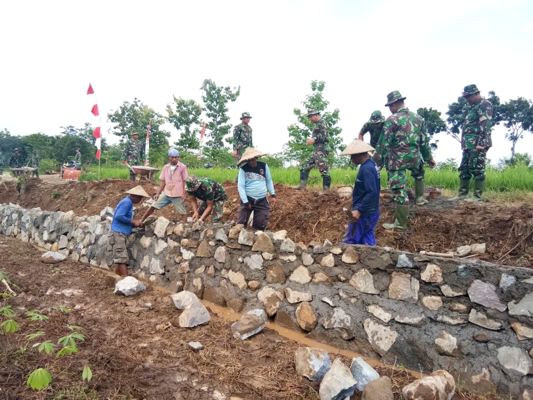 Sukoharjo(06/03/2019) – Satgas Tentara Manunggal Membangun Desa (TMMD) Reguler ke 104 Kodim 0726/Sukoharjo pengerjaan pembangunan talud jalan di areal pertanian Desa Celep Kecamatan Nguter Kabupaten Sukoharjo.