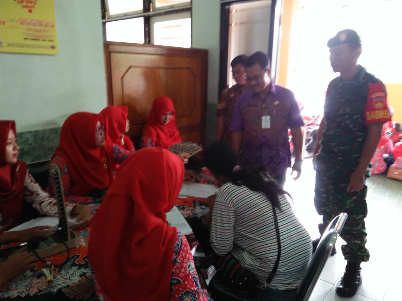 Sukoharjo (24/04/19) Bati Tuud Koramil 11 Polokarto Pelda Supardi bersama 2 orang anggota Babinsa melaksanakan pendampingan kegiatan Pelayanan KB Kesehatan dalam rangka bulan Bakti Aisyiyah Wilayah Sukoharjo Tahun 2019.