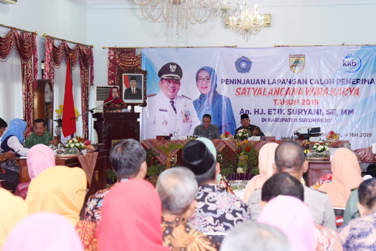 Hj. Etik Suryani menjadi Nominator Penerima Satyalancana Wira Karya bidang Keluarga Berencana dan Kesehatan, hari ini Sabtu (4/5), Tim Verifikasi Lapangan, yang diketuai Suprayitno, SE, M.Tr (Han), beserta rombongan, datang ke Sukoharjo untuk memverifikasi data di lapangan.
