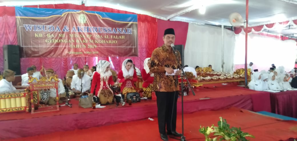 Acara dibuka dengan Pembacaan Al-quran oleh siswa siswi Ponpes Al-Falah dilanjutkan dengan menyanyikan Lagu Indonesia Raya yang di pimpin Ibu Sukarmi S.Pd.I, menyanyikan Lagu Ya Lal Wathon. Acara inti adalah Prosesi wisuda yang diberikan oleh bapak Sri Setyo SH,S.Pd.I,MSI bersama Ibu Endang Setyowati S.Pd.