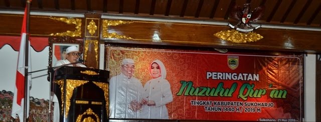 Dalam sambutannya, Bupati mengatakan Nuzulul Qur’an merupakan salah satu peristiwa bersejarah bagi umat Islam, yaitu peristiwa turunnya wahyu Al-Qur’an kepada Nabi Muhammad SAW untuk memberi petunjuk kepada manusia. Selain itu, Bupati berharap agar masyarakat di Kabupaten Sukoharjo memperkokoh persatuan serta mampu memahami ajaran ajaran Islam secara utuh dan sempurna. Dan menghindari tindakan kekerasan, terus merekatkan tali silaturahmi antar sesama dan menebarkan kedamaian antar sesama umat beragama, sehingga akan terwujud kondisi masyarakat Kabupaten Sukoharjo yang aman, damai dan kondusif.