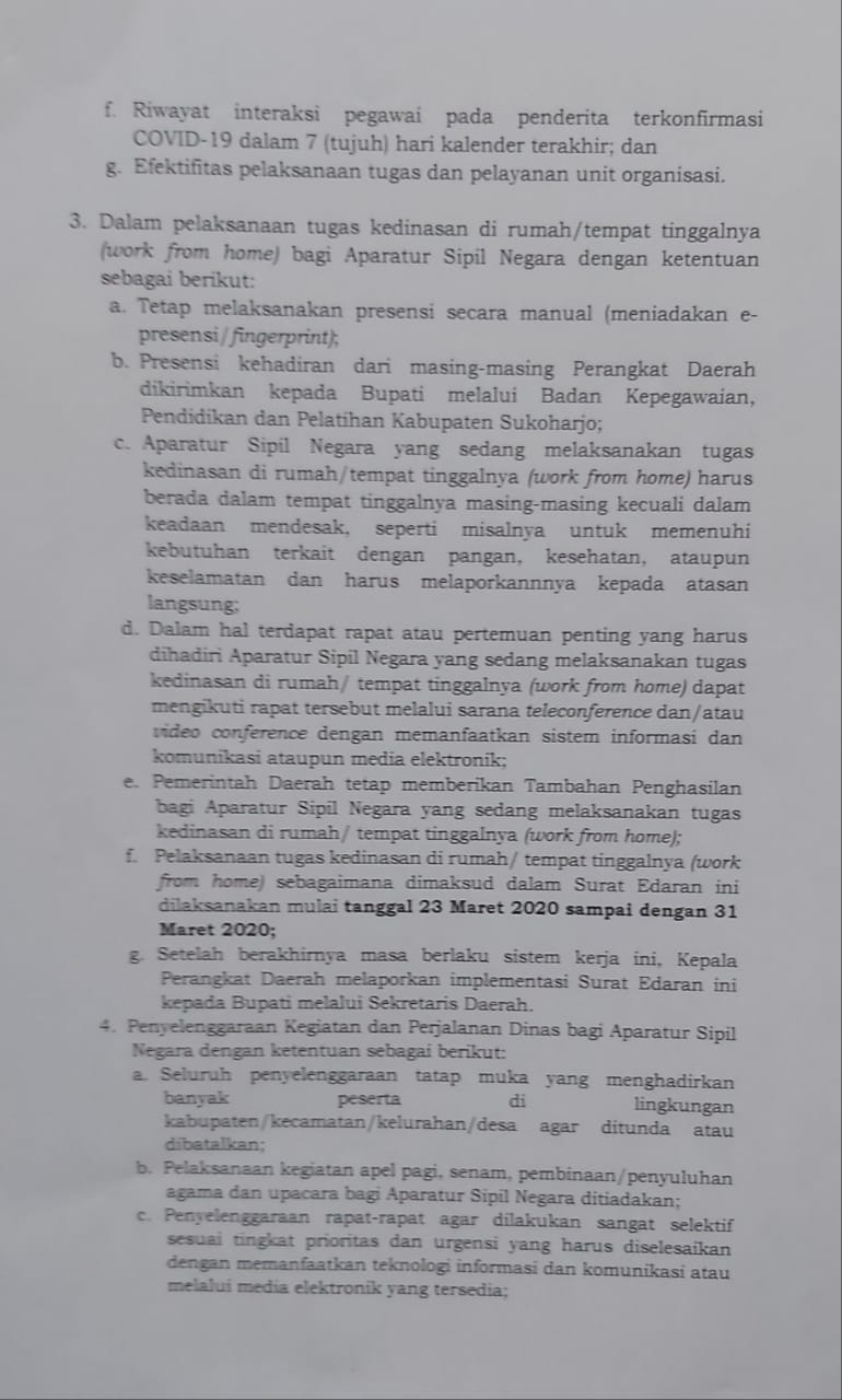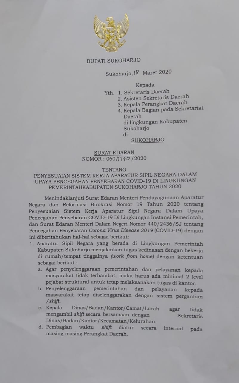 Dalam surat edaran tersebut, ASN Pemkab Sukoharjo agar menjalankan tugas kedinasan dengan bekerja dari rumah masing-masing (work from home) dengan ketentuan minimal 2 (dua) level pejabat struktural tertinggi untuk tetap melaksanakan tugasnya di kantor.