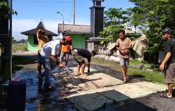 Sejumlah anak muda bersama dengan Babinsa Koramil 11 Polokarto tampak menyisir jalanan dan rumah-rumah penduduk untuk disemprot dengan disinfektan. selain penyemprotan disinfektan, fasilitas-fasilitas umum juga tampak dibersihkan oleh para karangtaruna desa Kayuapak tersebut, diantaranya Pos Kamling, Gapura dan gudang warga.