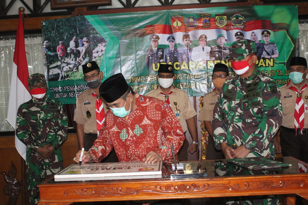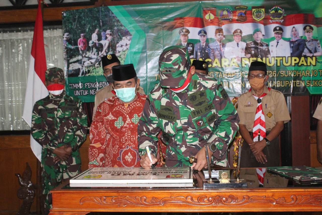 Penutupan TMMD Sengkuyung I dilaksanakan sederhana dengan penandatangan berita acara penyerahan hasil TMMD Sengkuyung Tahap I oleh Dandim Letkol Inf. Chandra Ariyadi Prakosa pada Bupati Wardoyo Wijaya di lobby Kantor Bupati, Selasa (14/04/2020).