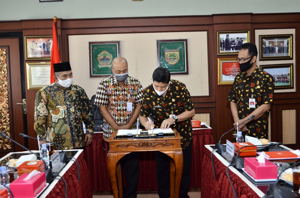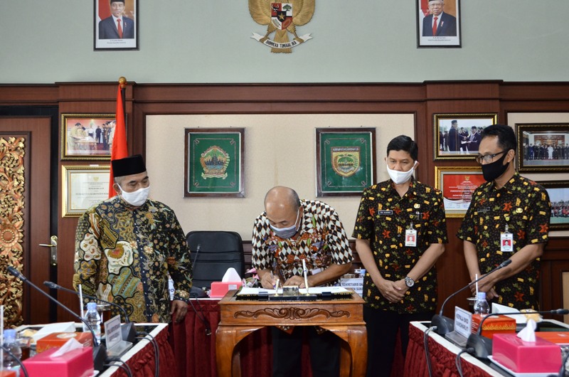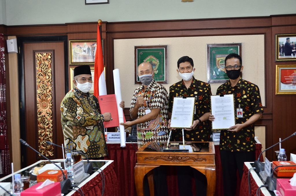 SUKOHARJO– Penandatangan Perjanjian Kerjasama Badan Keuangan Daerah (BKD) dengan Kantor Pertanahan Kabupaten Sukoharjo tentang pengintegrasian dan pemanfaatan Sistem Informasi Data Pertanahan dan Penyerahan Peta Zona Nilai Tanah (ZNT) sertifikat aset Pemkab tahun 2020 kepada Bupati Sukoharjo H. Wardoyo Wijaya SH,MH, MM, dilaksanakan di  Ruang Rapat Bupati, Kamis (11/6).