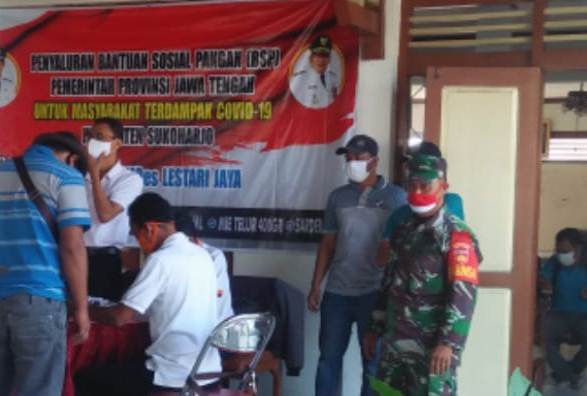 Sukoharjo (14/06/20) Bertempat di balai Desa Sanggung Babinsa Koramil 07 Gatak wilayah Desa Sanggung Serka Pri Haryanto melaksanakan Pengamanan Pembagian BSNT Propinsi Jateng berupa sembako kepada warga yang terdampak Covid 19, Sabtu (13/06/20)