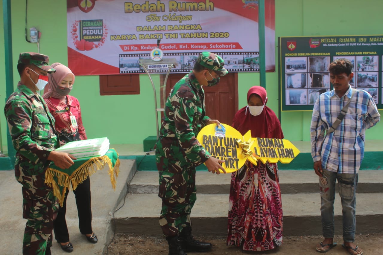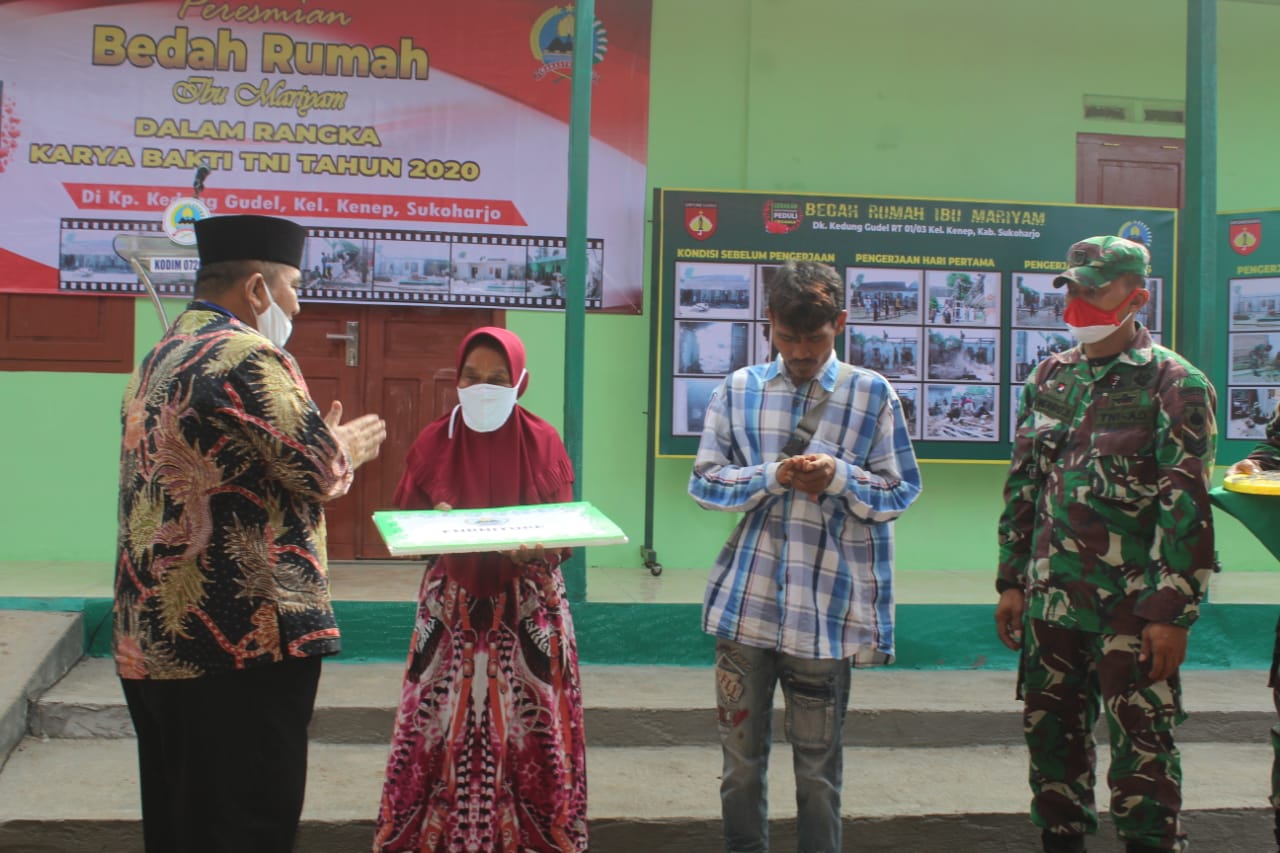 Peresmian Bedah Rumah (RTLH) Ibu Mariyam ini dilaksanakan dalam Rangka Karya Bakti TNI Tahun 2020 dengan Tema Gerakan Kodim 0726/Sukoharjo Peduli Sesama. Diresmikan oleh Bupati Sukoharjo H. Wardoyo Wijaya, S.H., M.H., M.M dan Dandim 0726/Sukoharjo Letkol Inf Chandra Ariyadi Prakosa, S.I.P, M.Tr (Han)pada pukul 09.00 wib. Tak kuasa mbah Mariyem menahan haru terbawa suasana gembira. Peresmian itu dihadiri oleh para Muspida Kabupaten Sukoharjo, dan sekitar 70 orang hadir pada moment yang membanggakan bagi warga Kedung Gudel tersebut.