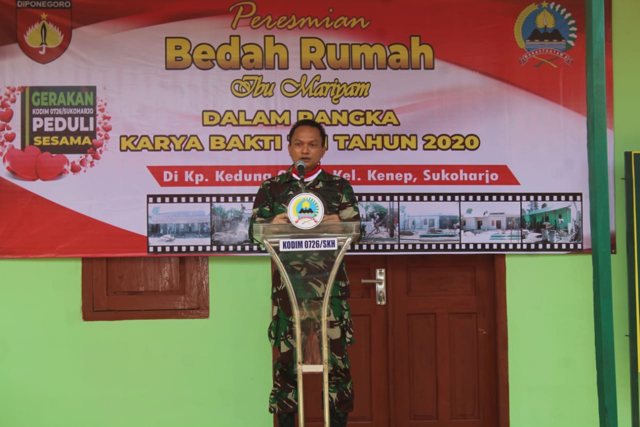 ” Karya bakti Kodim 0726/Sukoharjo dengan sasaran bedah rumah milik lbu Mariyam dilaksanakan dalam kurun waktu 17 hari yang dimulai pada hari selasa 2 Juni 2020. Rumah yang semula tidak layak huni kini dapat dinikmati oleh lbu Mariyam berkat kerjasama dan uluran tangan serta kemurahan hati para Donatur sekalian, ” kata Dandim 0726/Sukoharjo dalam sambutannya.