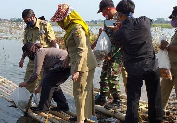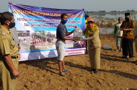 Sukoharjo (14/07/20) Penebaran benih ikan gurameh dan nila di area waduk Mulur, Bendosari, Sukoharjo diberikan kepada kelompok karamba Mina tani warga Mulur kec. Bendosari, Senin (13/07/20).