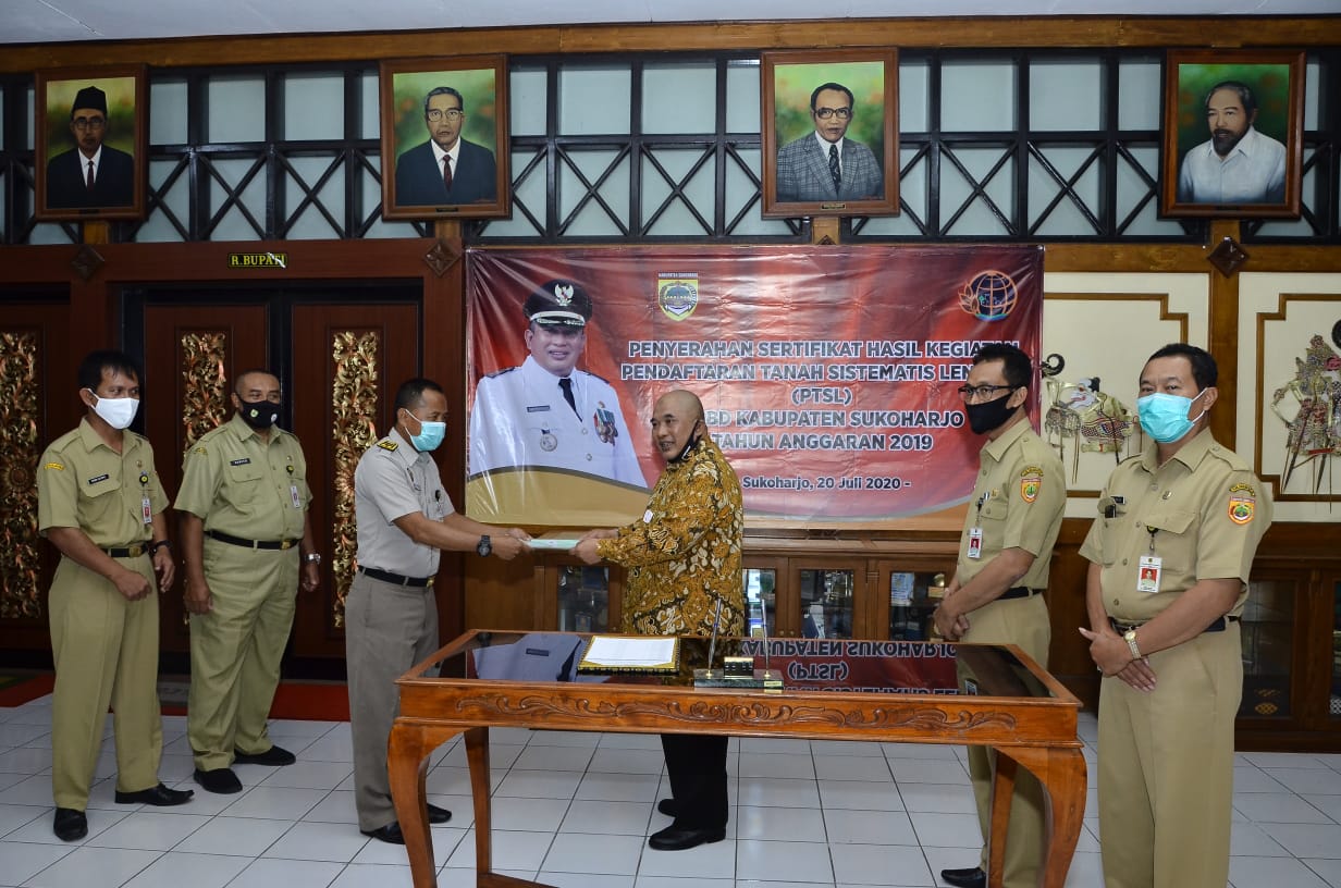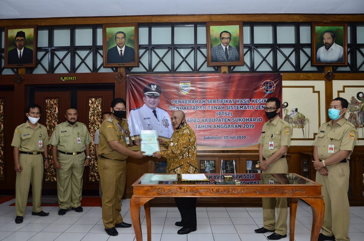 SUKOHARJO– Bertempat di ruang loby Bupati Sukoharjo, Bupati H. Wardoyo Wijaya SH., MH., MM bersama jajaran Kantor Pertanahan Kabupaten Sukoharjo, serahkan 1.623  sertifikat tanah hasil kegiatan pendaftaran tanah sistematis lengkap ( PTSL) APBD tahun anggaran 2019 secara simbolis kepada 12 camat, selanjutnya camat akan meneruskan sertifikat tersebut pada kepala desa/lurah hingga sampai masyarakat, bertempat di Loby Kantor Bupati, , Senin (20/7/2020).