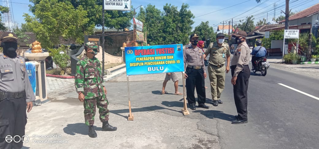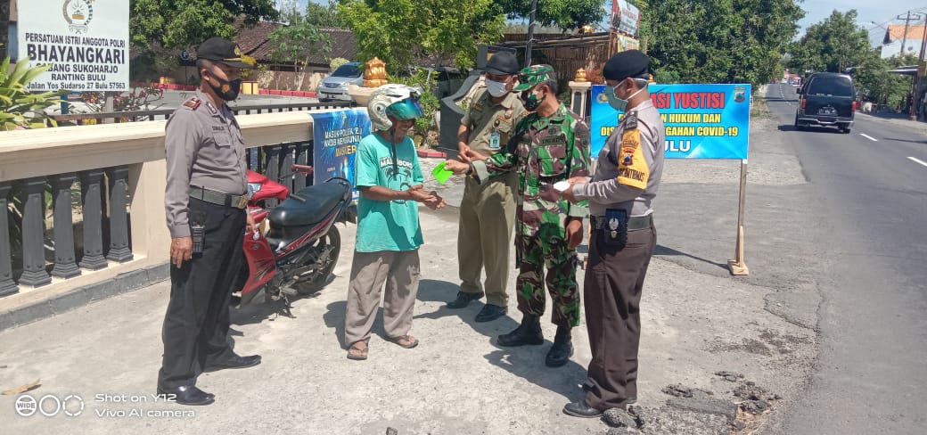 Operasi Yustisi dilaksanakan di semua wilayah Sukoharjo melibatkan unsur dari Koramil, Polsek, Satpol PP, Dinas Kesehatan, Dishub hingga Pemdes. Seperti halnya di wilayah Kecamatan Bulu, pada hari Kamis (24/09) pukul 09.00 wib anggota Koramil 03/Bulu bersama dengan Polsek Bulu melaks Operasi Yustisi serta himbauan kepada warga masyarakat agar mematuhi Protokol Kesehatan demngan melaksanakan 3 M memakai masker, mencuci tangan dan menjaga jarak guna pencegahan Covid 19 di wilayah Kecamatan Bulu, Sukoharjo.