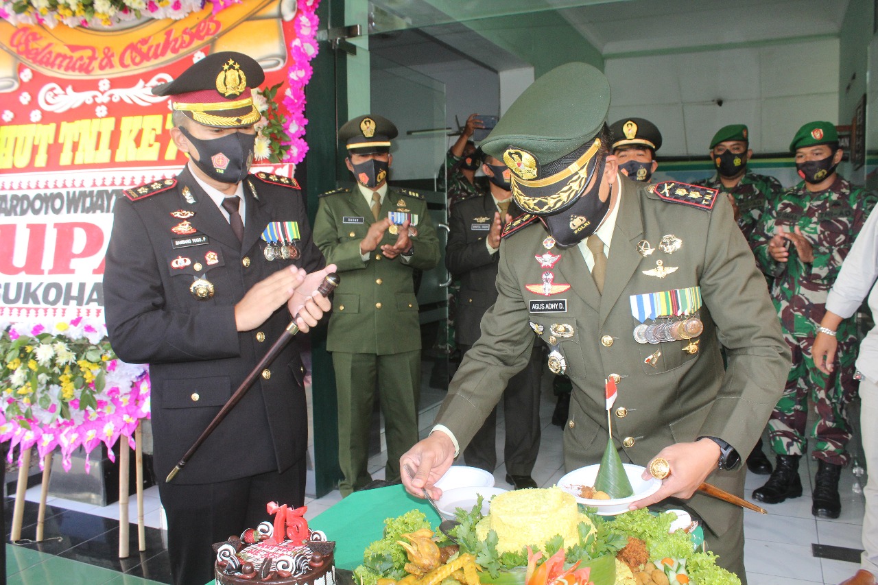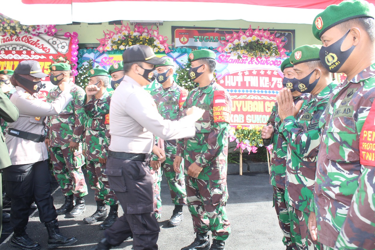 Sukoharjo (05/10/20) Puluhan Anggota Polres Sukoharjo, dipimpin Kapolres Sukoharjo AKBP Bambang Yugo Pamungkas , S.I.K., M.H., M.Si mendatangai Makodim 0726/Sukoharjo, pada hari Senin (05/10/20). Kedatangan rombongan dari Polres tersebut adalah dalam rangka pemberian ucapan selamat HUT Ke 75 TNI tahun 2020.