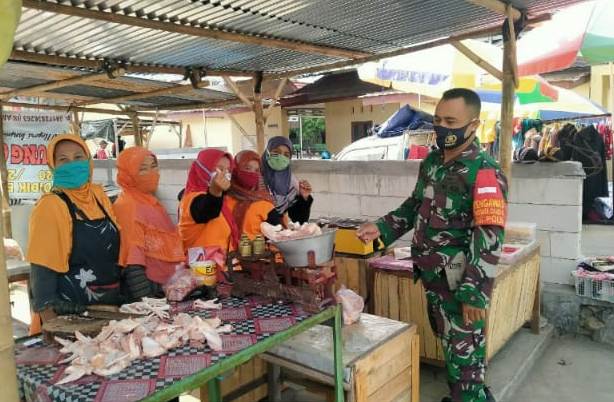 Dalam hal ini selain memastikan penegakan disiplin terhadap 3M di lapangan, Babinsa juga aktif melaksanakan himbauan dan edukasi. Seperti halnya Babinsa Desa Lawu Koramil 02/Nguter, pada hari Sabtu (11/10) tampak sedang menyambangi para ibu-ibu pedagang pasar melaksanakan edukasi dan himbauan tentang protokol kesehatan.
