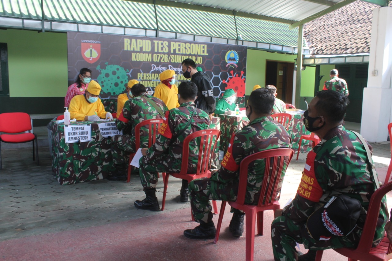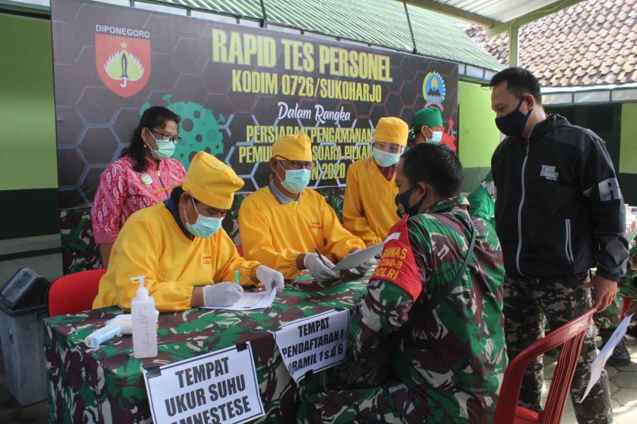 Para personel Kodim 0726/Sukoharjo yang melaksanakan rapid test adalah para Babinsa ldi wilayah masing-masing yang diperbantukan untuk membackup pengamanan Pilkada serentak untuk pemilihan Bupati dan Wakil Bupati Kabupaten Sukoharjo periode 2020.