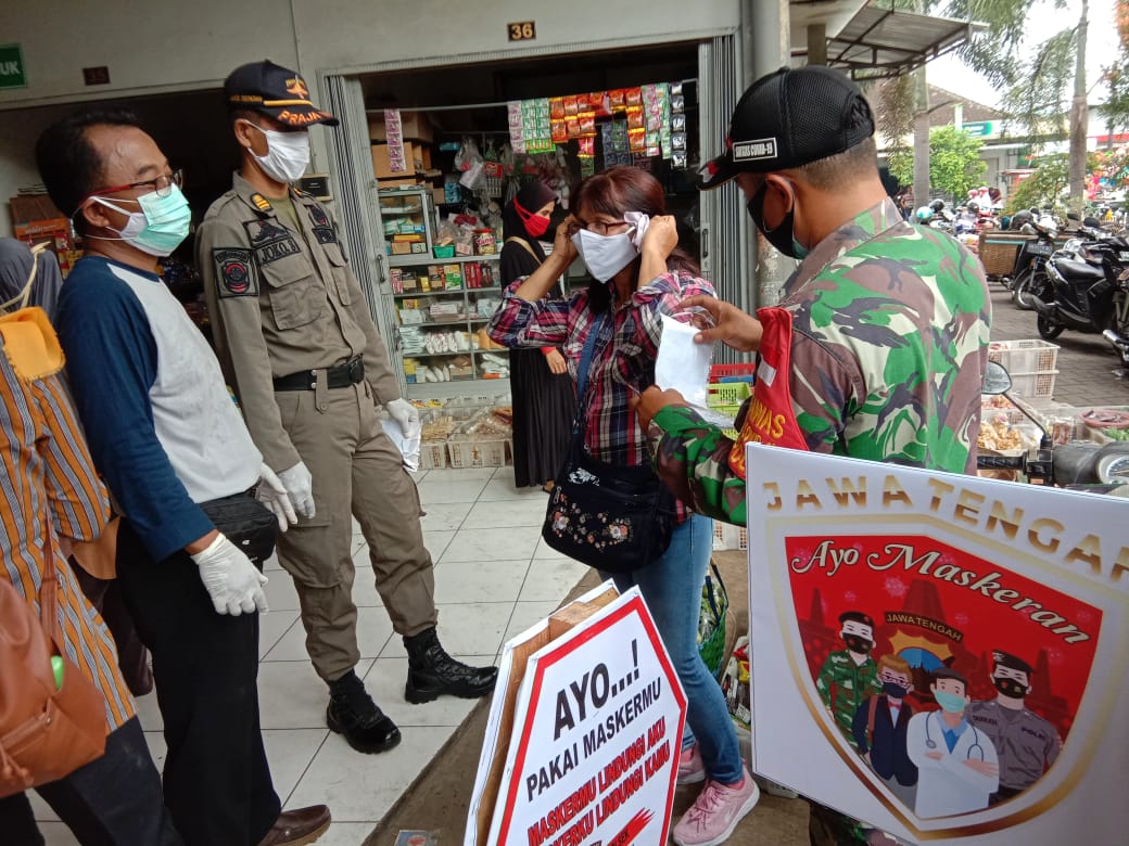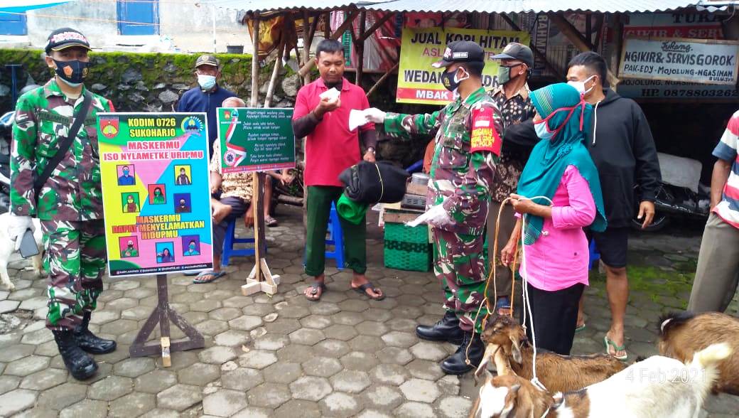 Sukoharjo (08/02/2021)-Koramil 04/Tawangsari bersamaSatgas Covid 19 tingkat Kec. Tawangsari terus mengingatkan warga dalam penerapan protokol kesehatan 5 M Memakai Masker, Mencuci Tangan, Menjaga Jarak, Menghindari Kerumunan dan Mengurangi Kegiatan Di Luar Rumah serta membagikan masker, di Pasar Hewan Tawangsari,Senin(08/02/2021).
