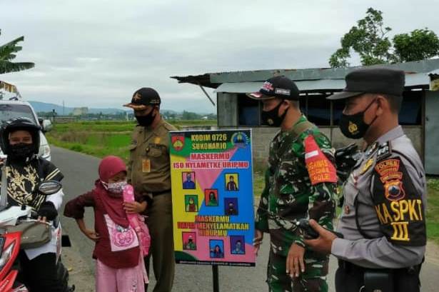 Sukoharjo (24/02/2021) – Anggota Koramil 02/Nguter dan Polsek Nguter beserta Satgas Covid-19 Kecamatan Nguter gencar melaksanakan Himbauan 5M (memakai masker, mencuci tangan dengan sabun,menjaga jarak, menghindari kerumunan dan mengurangi mobilitas) guna mencegah penyebaran Covid-19.