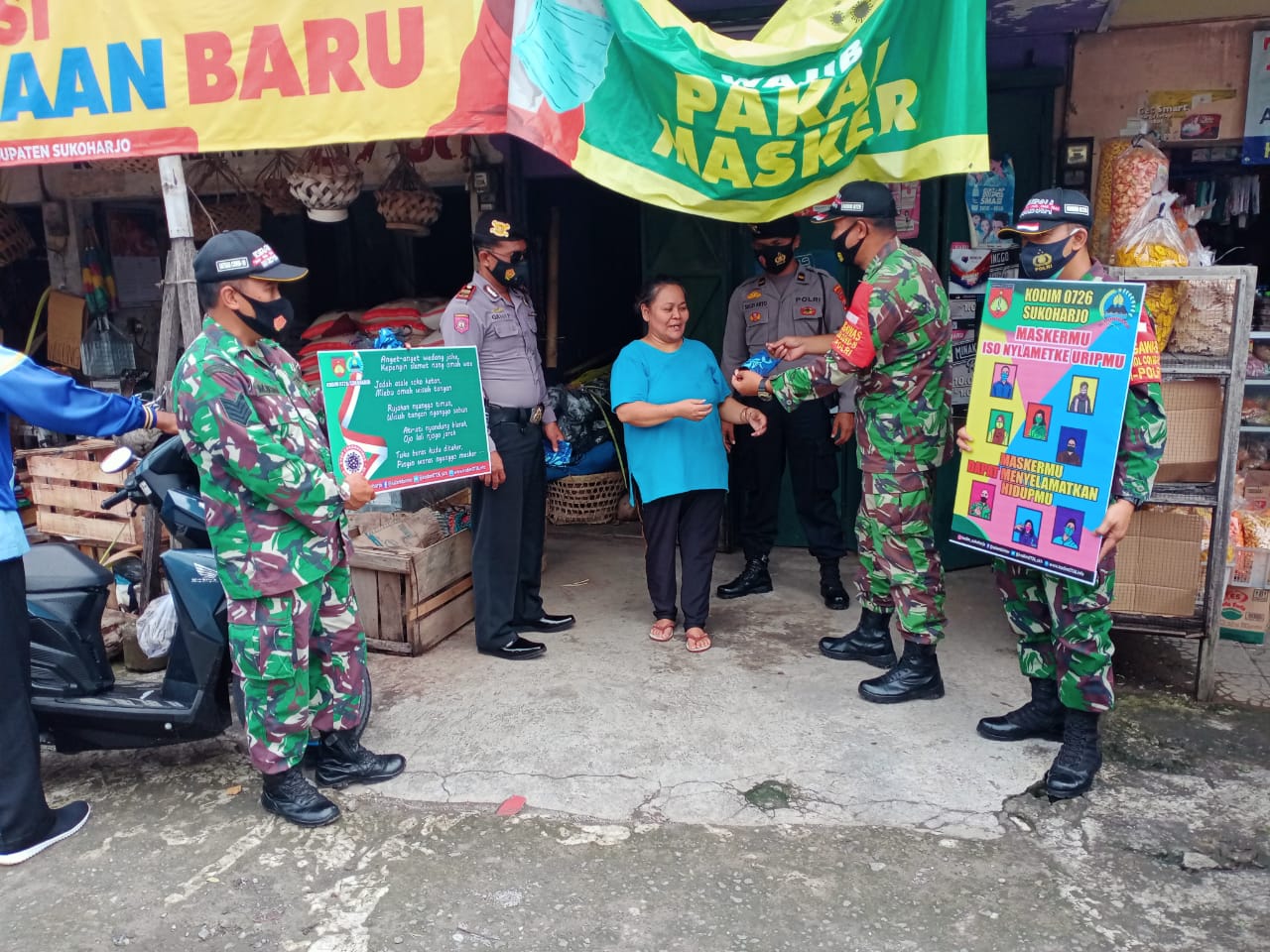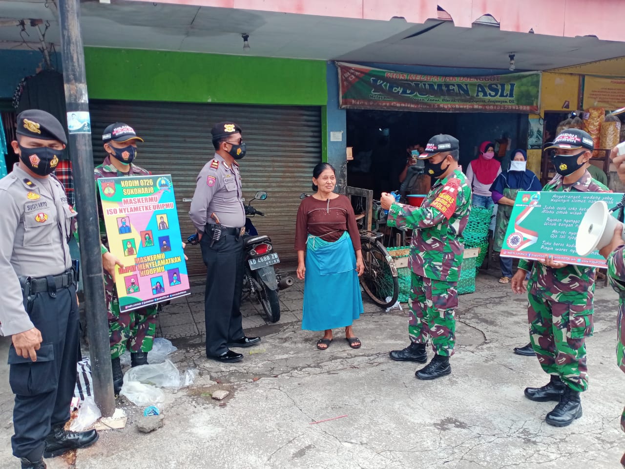 Pasar tradisional masih menjadi perhatian khusus bagi Tim Gugus Penanggulangan Covid 19 wilayah Kecamatan Sukoharjo untuk dilaksanakan operasi yustisi, himbauan serta edukasi perihal pandemi covid 19.