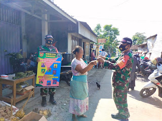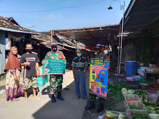 Sukoharjo(01/05/2021)- Untuk memutus penyebaran Covid 19, Koramil 01/Sukoharjo melaksanakan himbauan Prokes 5M dan membagikan masker kepeda pedagang dan pengunjung di pasar Sukoharjo
