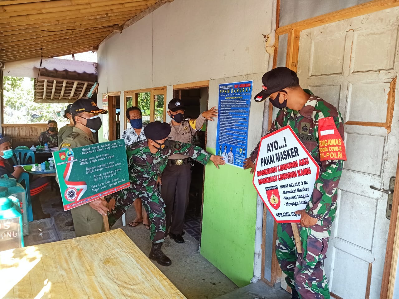 Sukoharjo(10/07/2021)-Dalam rangka mensosialisasikan peraturan protokol kesehatan dimasa PPKM Darurat, Koramil 03/Bulu, Polsek dan Satpol PP Kec. Bulu melaksanakan Pemasangan Pamplet PPKM Darurat  Kab. Sukoharjo, di warung-warung makan di wilayah Kec. Bulu Kab. Sukoharjo, Sabtu (10/07/2021).
