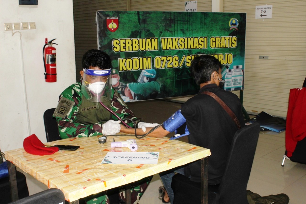 Sukoharjo (17/07/21) Dalam rangka membantu percepatan vaksinasi covid 19 di wilayah Kabupaten Sukoharjo, Kodim 0726/Sukoharjo pada hari Sabtu (17/07/21), kembali melaksanakan serbuan vaksinasi TNI terhadap 1000 orang warga masyarakat Sukoharjo bertempat di Sentra Niaga, Solobaru, Grogol, Kabupaten Sukoharjo.