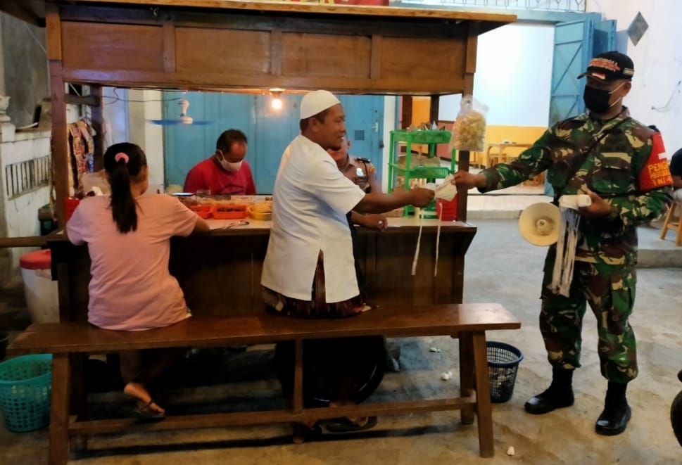 Ditengah PPKM Level 3 Babinsa KOramil 01 Sukoharjo intensif Edukasi Prokes di Pasar Cuplik