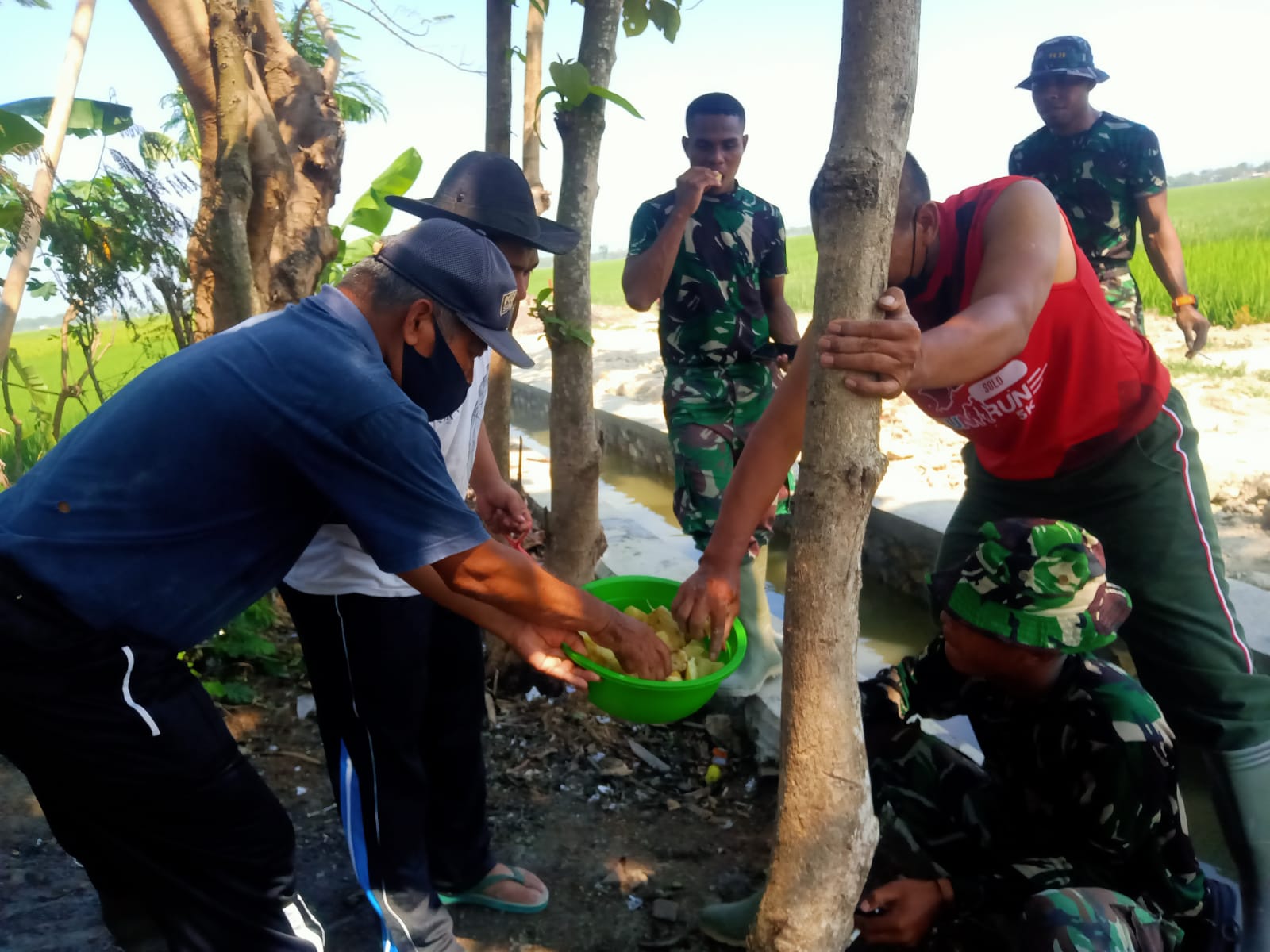 Jalin keakraban, Warga dan bapak TNI kompak makan bersama di Lokasi Pengurugan Talud di Dk. Majasto – Dk. Boto