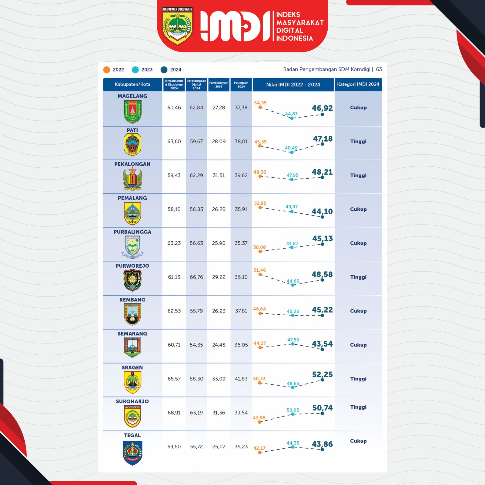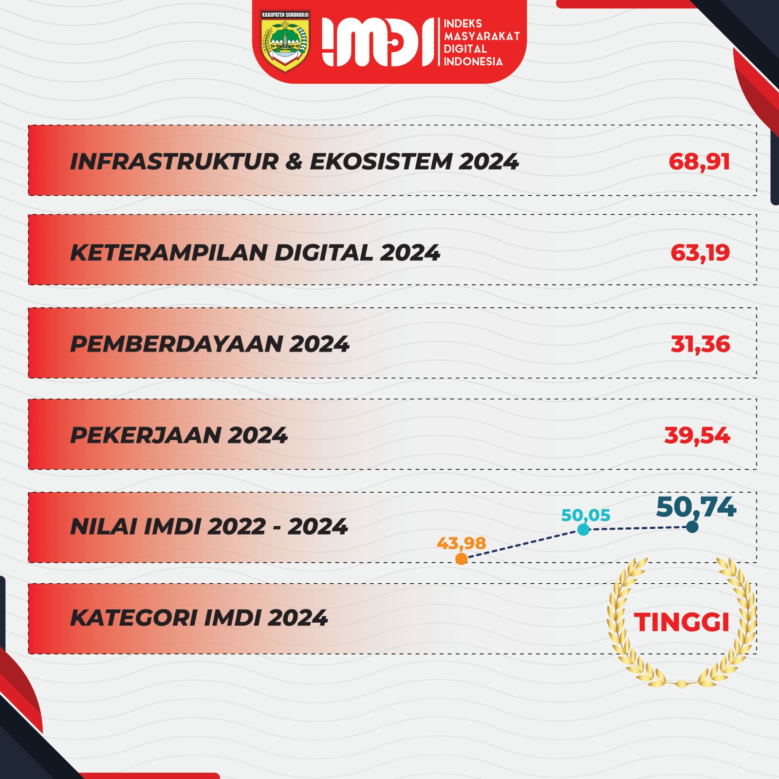 Kabupaten Sukoharjo meraih kategori Tinggi dalam Penilaian Indeks Masyarakat Digital Indonesia (IMDI) selama dua tahun berturut-turut. Pencapaian ini menegaskan komitmen Pemkab Sukoharjo dalam mendukung transformasi digital nasional.