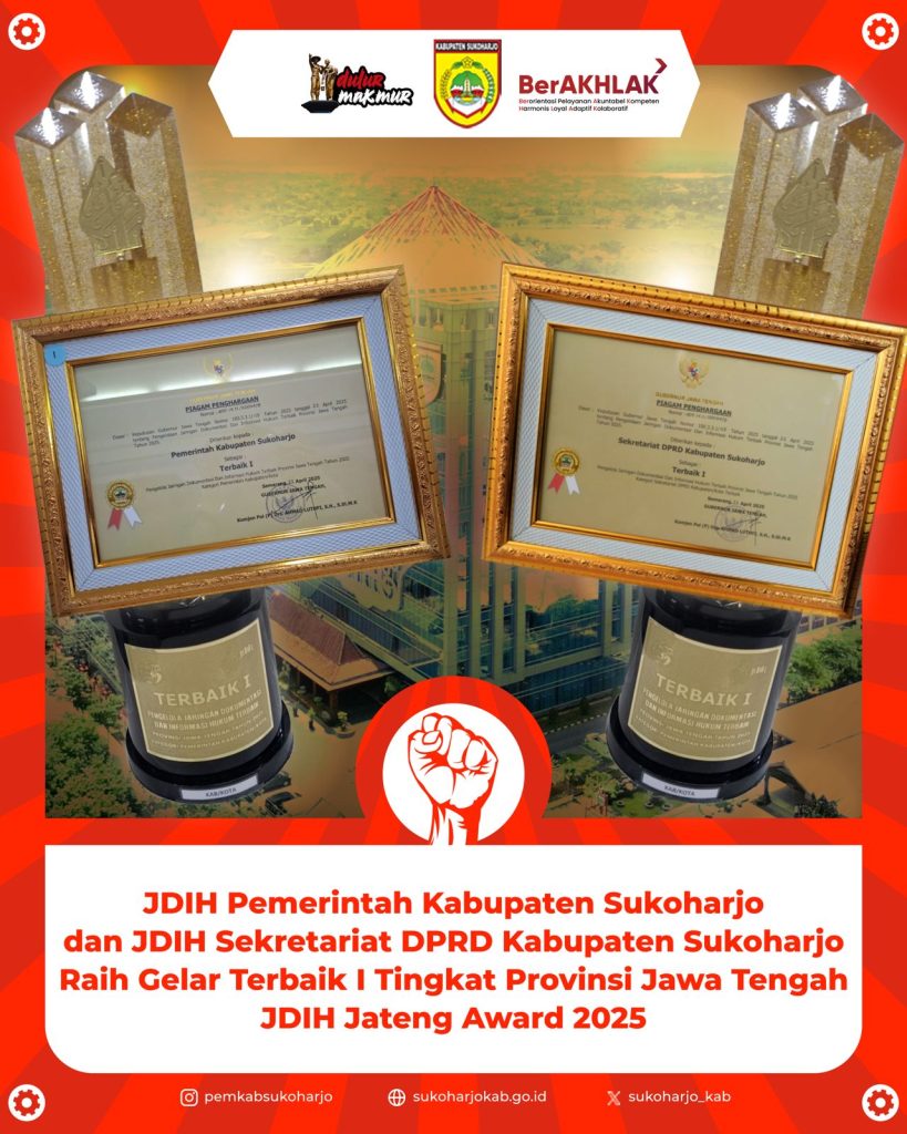 SUKOHARJO – Jaringan Dokumentasi dan Informasi Hukum (JDIH) Kabupaten Sukoharjo dan JDIH Sekretariat DPRD Kabupaten Sukoharjo berhasil meraih penghargaan sebagai “Terbaik I” pada ajang penghargaan Pengelola Jaringan Dokumentasi dan Informasi Hukum Terbaik Provinsi Jawa Tengah Tahun 2025.