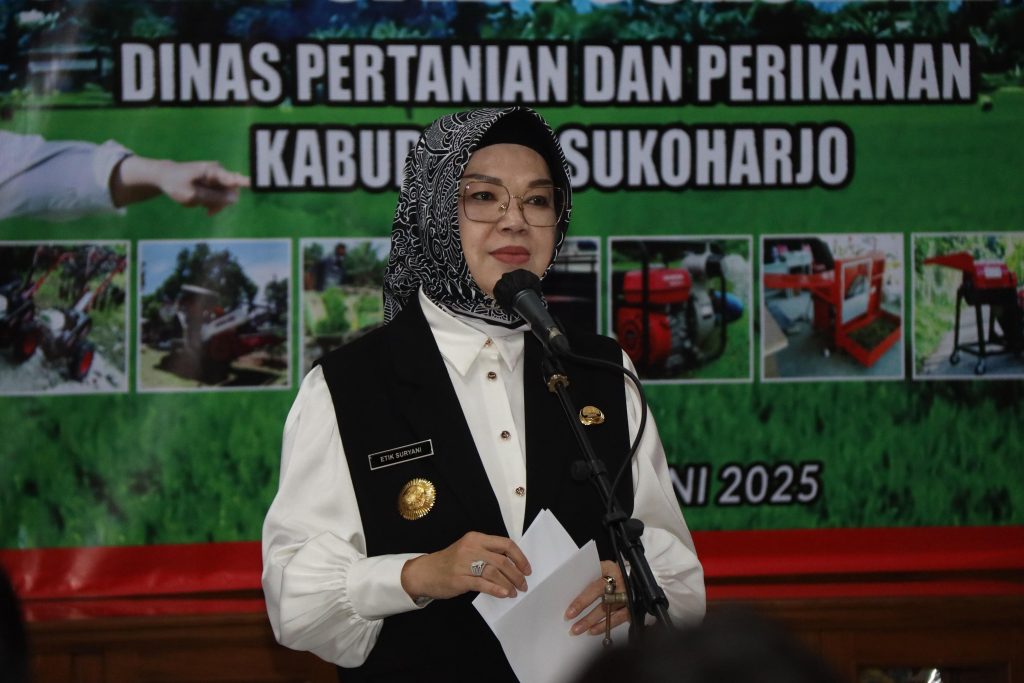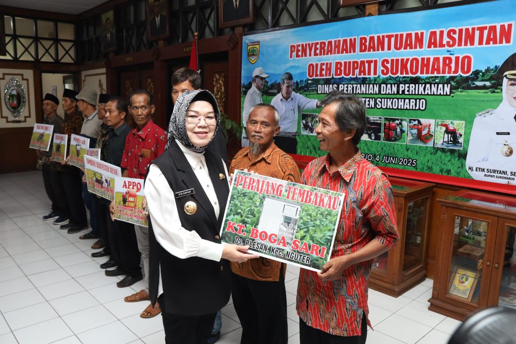 SUKOHARJO – Bupati Sukoharjo Hj. Etik Suryani menyerahkan bantuan alat dan mesin pertanian kepada kelompok tani di Kabupaten Sukoharjo, Rabu (4/6/2025). Penyerahan dilakukan di Lobby Bupati Sukoharjo dan dihadiri berbagai pejabat daerah serta perwakilan petani.