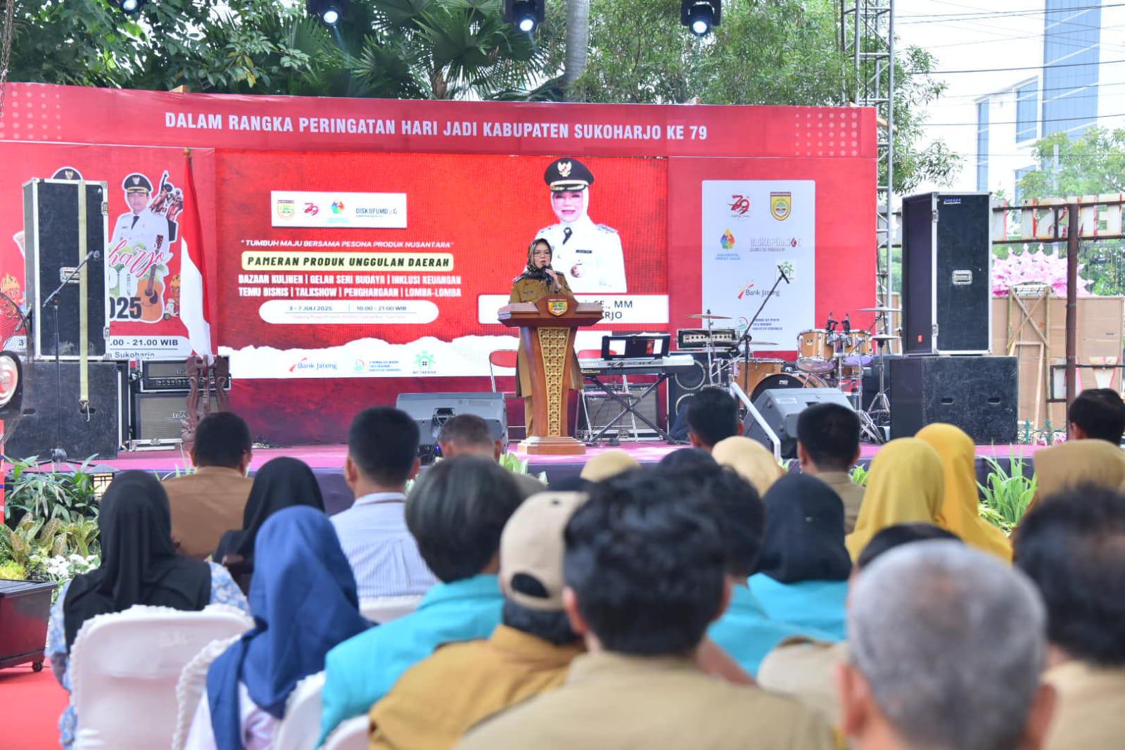 Di akhir sambutan, Bupati mengajak seluruh lapisan masyarakat untuk tetap menjaga semangat gotong royong, mendukung produk lokal, dan terus berkontribusi dalam pembangunan Kabupaten Sukoharjo yang lebih maju, mandiri, dan berdaya saing.