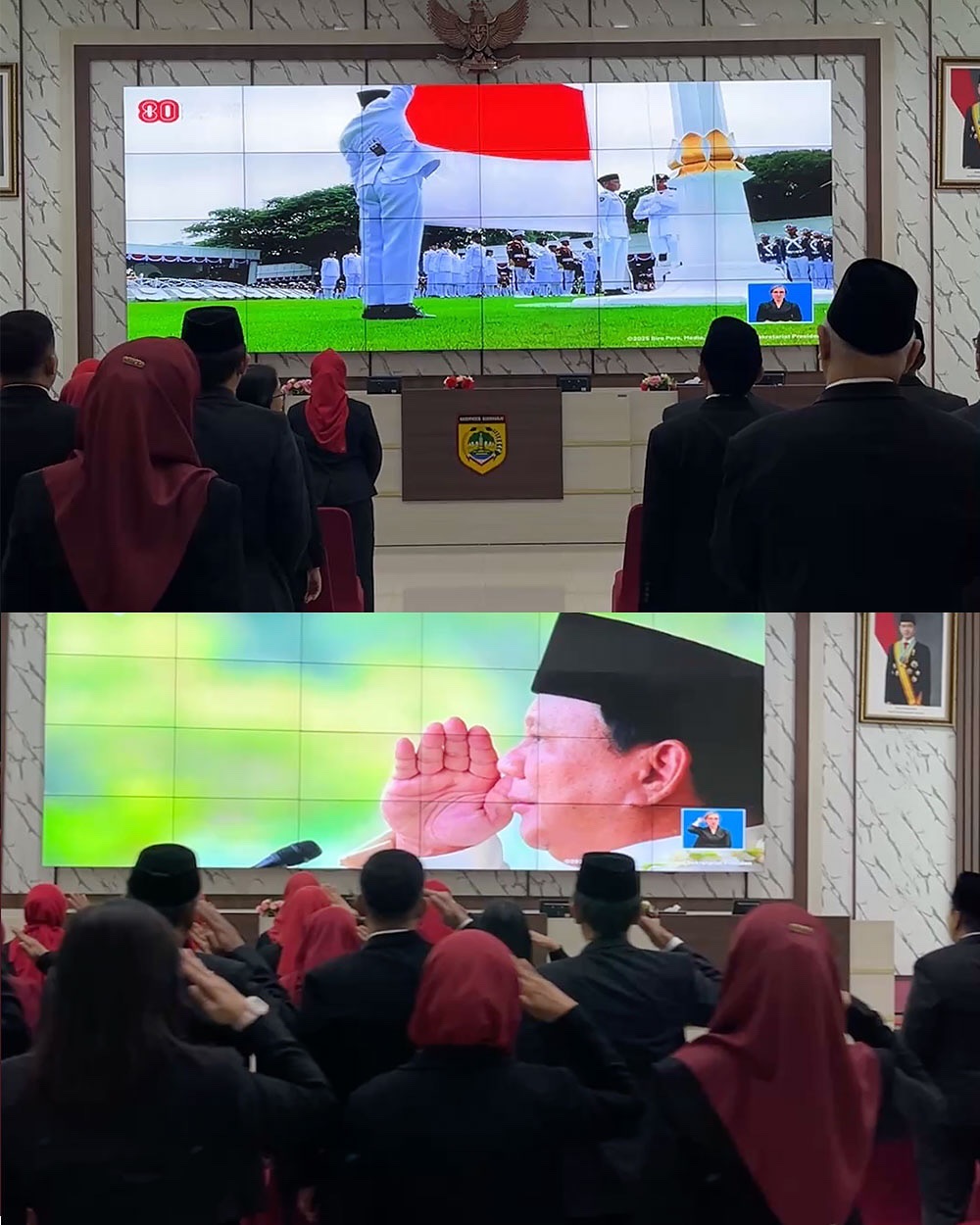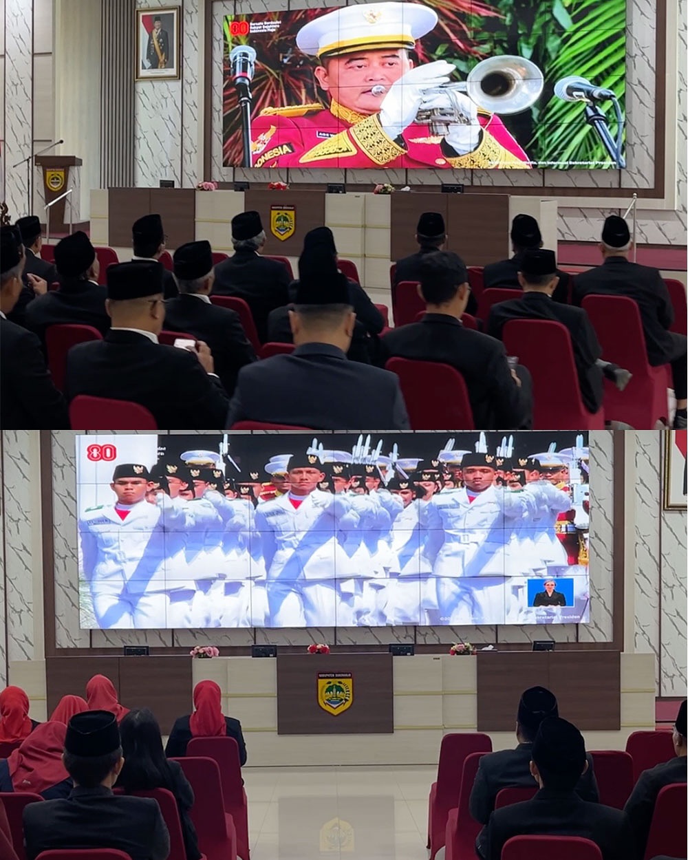 Pemkab Sukoharjo Laksanakan Upacara Peringatan HUT RI ke-80, bertempat di Halaman Setda Sukohajo, serta menyaksikan secara virtual dari Auditorium Utama Gedung Menara Wijaya Sukoharjo, Minggu (17/08/2025).