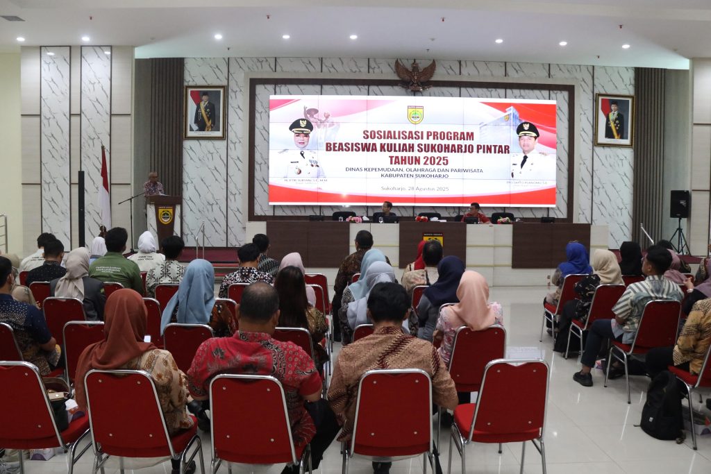 SUKOHARJO – Dinas Pemuda Olahraga dan Pariwisata Sukoharjo menggelar sosialisasi program Beasiswa Kuliah Sukoharjo Pintar pada Kamis (28/8/2025). Program ini merupakan bagian dari misi kedua kepemimpinan Bupati dan Wakil Bupati Sukoharjo periode 2025-2029 untuk meningkatkan kualitas sumber daya manusia.