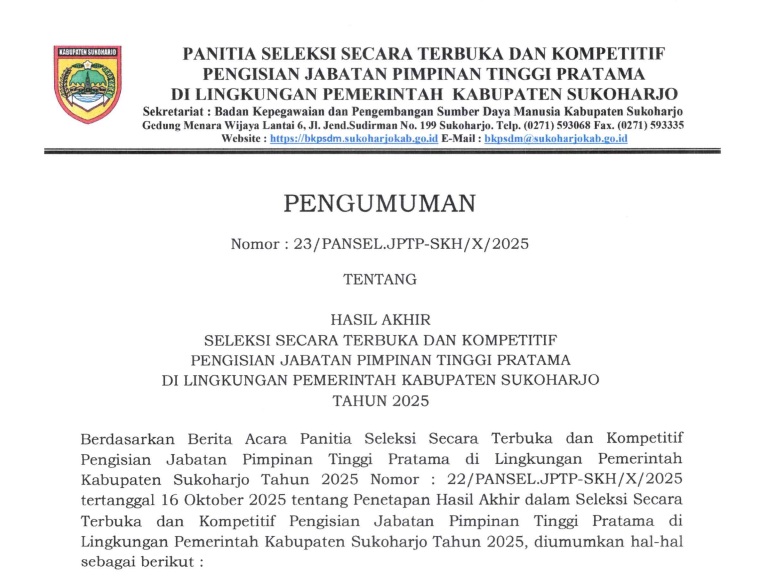 Berdasarkan Berita Acara Panitia Seleksi Secara Terbuka dan Kompetitif Pengisian Jabatan Pimpinan Tinggi Pratama di Lingkungan Pemerintah Kabupaten Sukoharjo Tahun 2025 Nomor : 22/PANSEL.JPTP-SKH/X/2025 tertanggal 16 Oktober 2025 tentang Penetapan Hasil Akhir dalam Seleksi Secara Terbuka dan Kompetitif Pengisian Jabatan Pimpinan Tinggi Pratama di Lingkungan Pemerintah Kabupaten Sukoharjo Tahun 2025, diumumkan hal-hal sebagaimana terlampir diatas.
