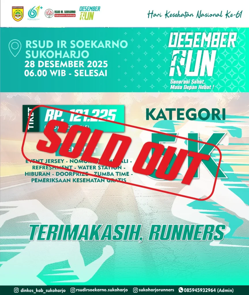 Dalam rangka memperingati Hari Kesehatan Nasional ke-61, Pemerintah Kabupaten Sukoharjo melalui RSUD Ir. Soekarno Kabupaten Sukoharjo menyelenggarakan “Desember Run” dengan mengusung tema : “Generasi Sehat, Masa Depan Hebat!” Minggu 28 Desember 2025 mendatang.
